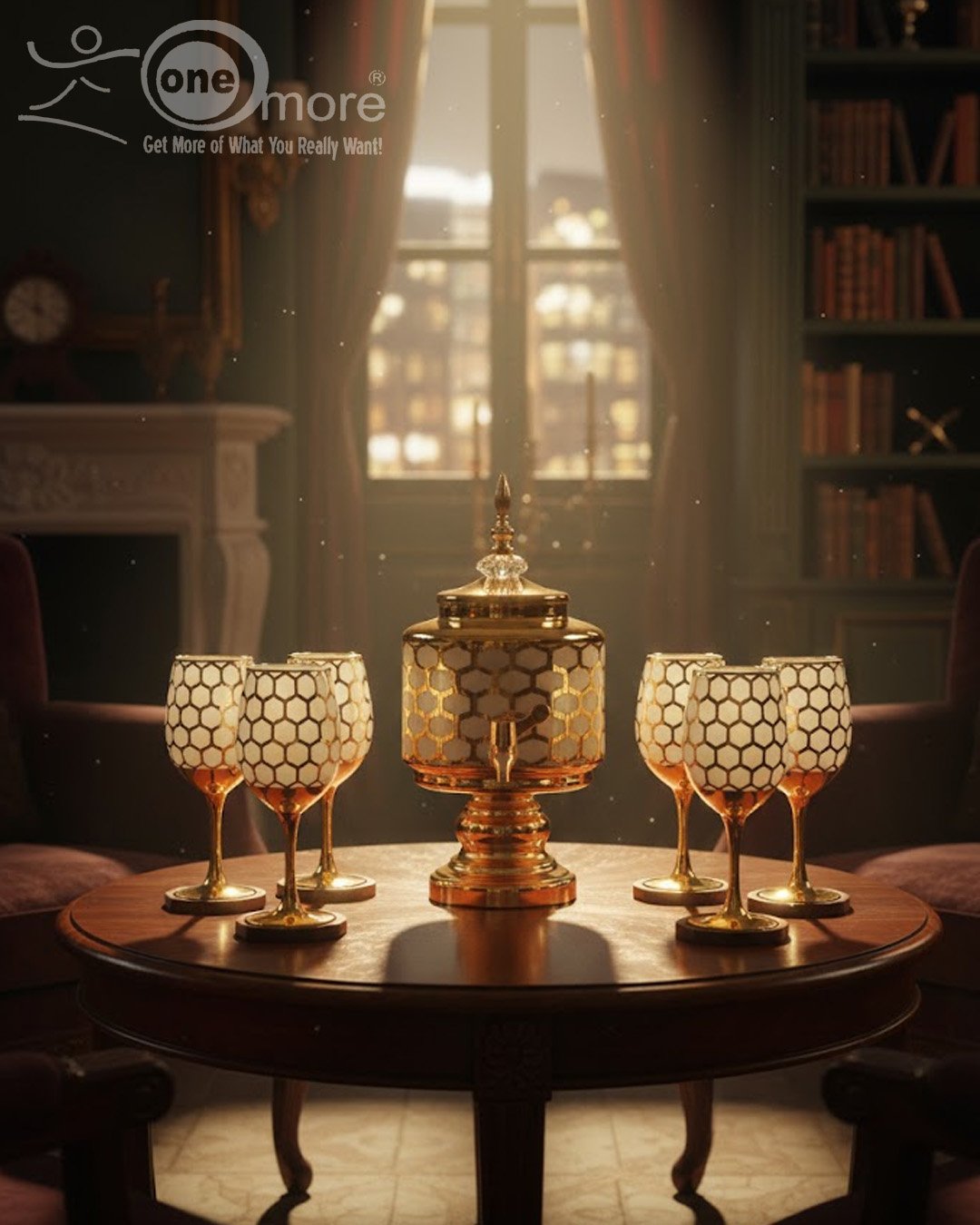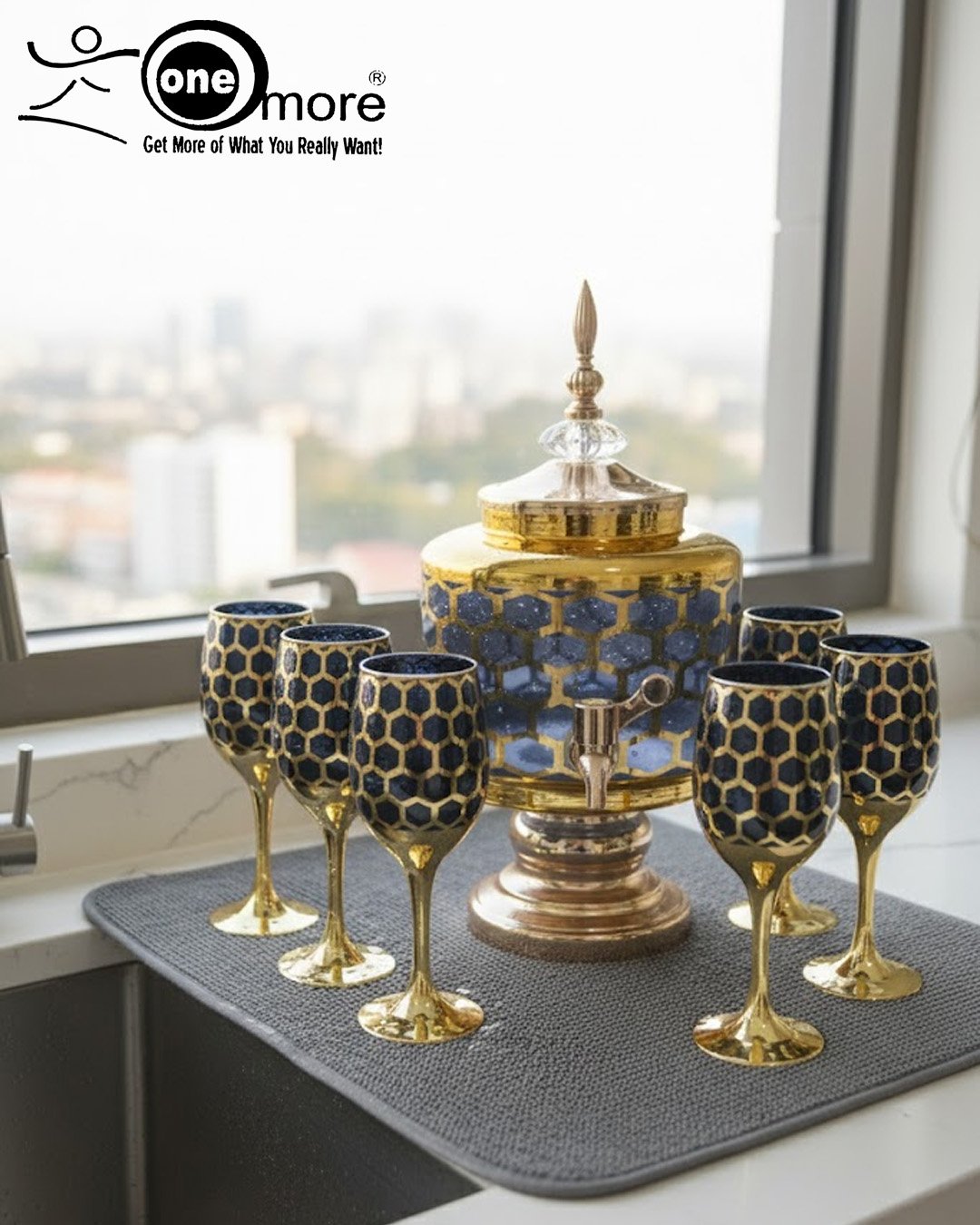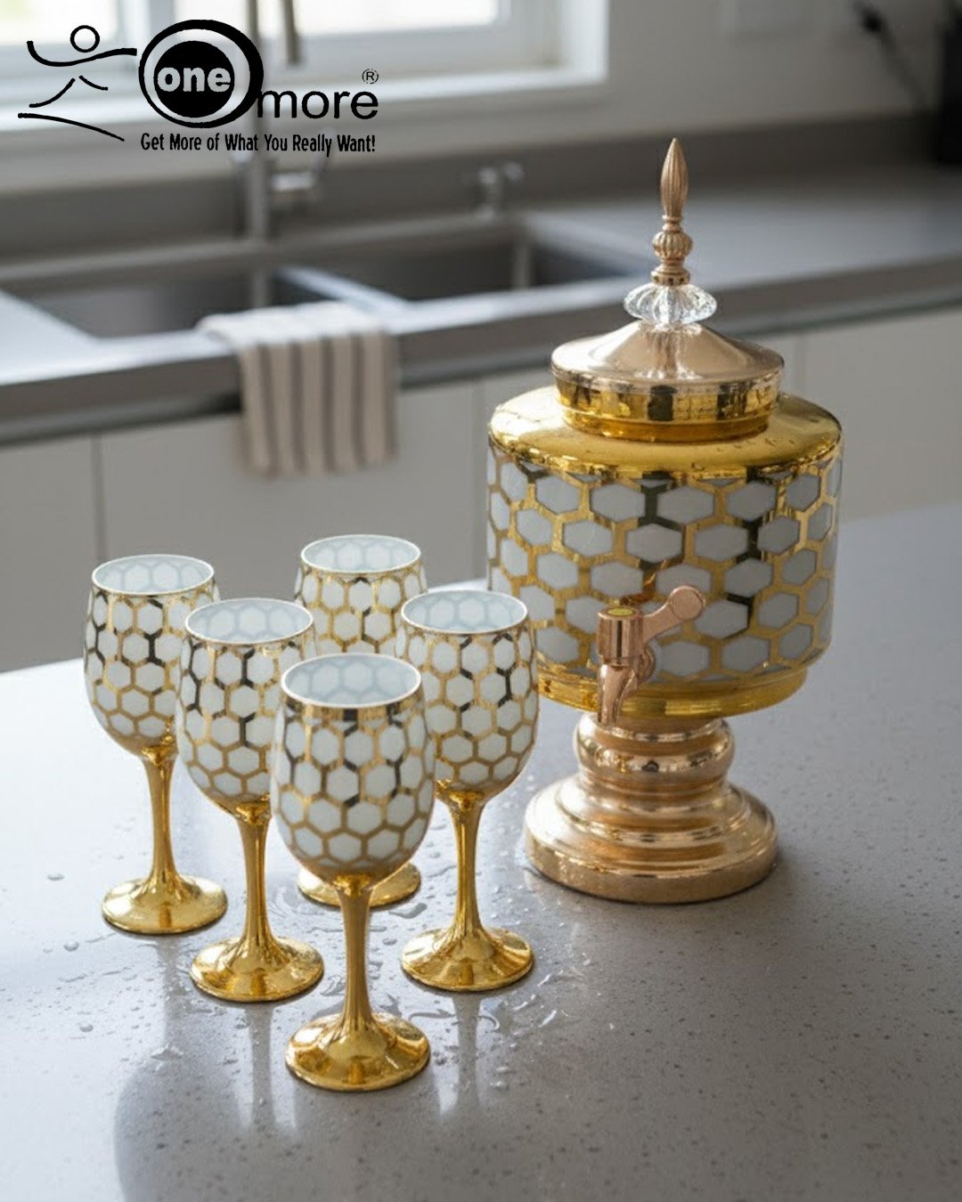 Luxury Honey Comb Golden Glass Drink Dispenser Set with Goblets