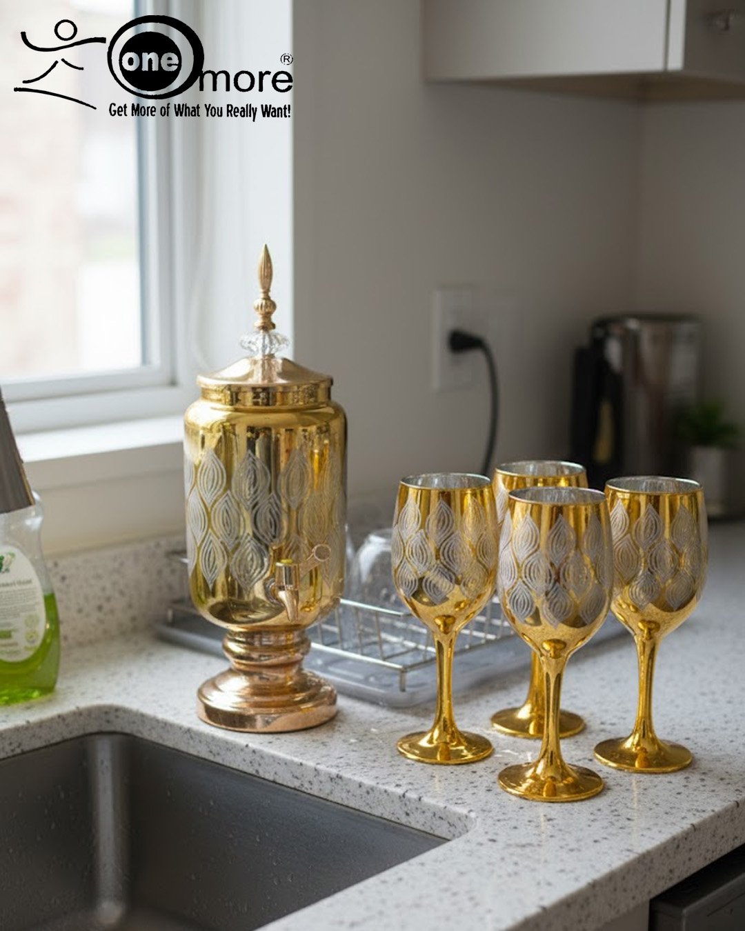 Introduce a touch of floral elegance to your table with this gorgeous 7-piece gold-tone beverage dispenser and goblet set. The set includes a stately square dispenser with a matching base, spigot, and lid, plus six finely crafted stemmed goblets. Each piece is decorated with a delicate, scrolling gold floral/vine pattern that beautifully catches the light, while the goblets feature a solid gold base. Perfect for serving refreshments at formal dinners, holidays, or adding a luxurious accent to your home decor.