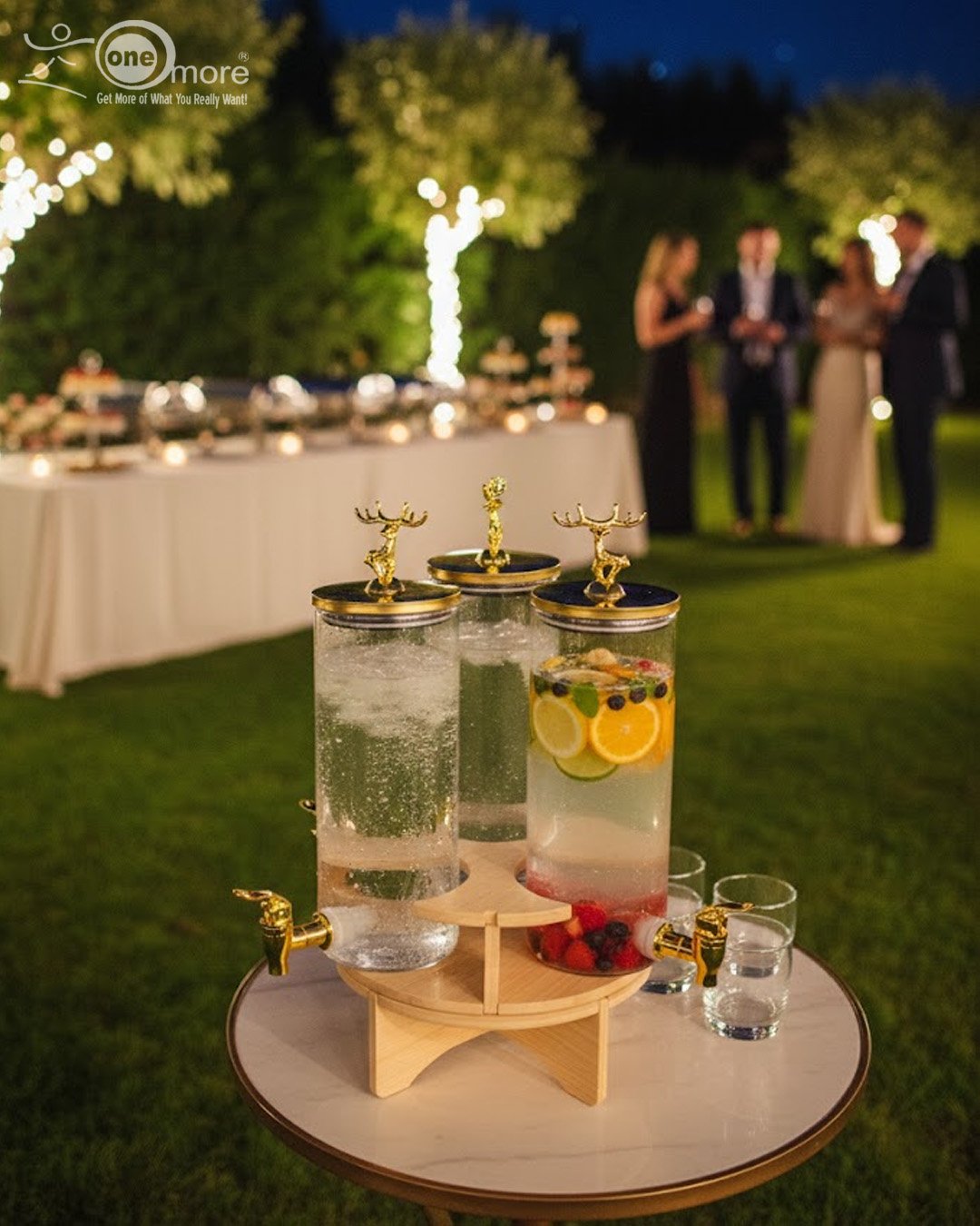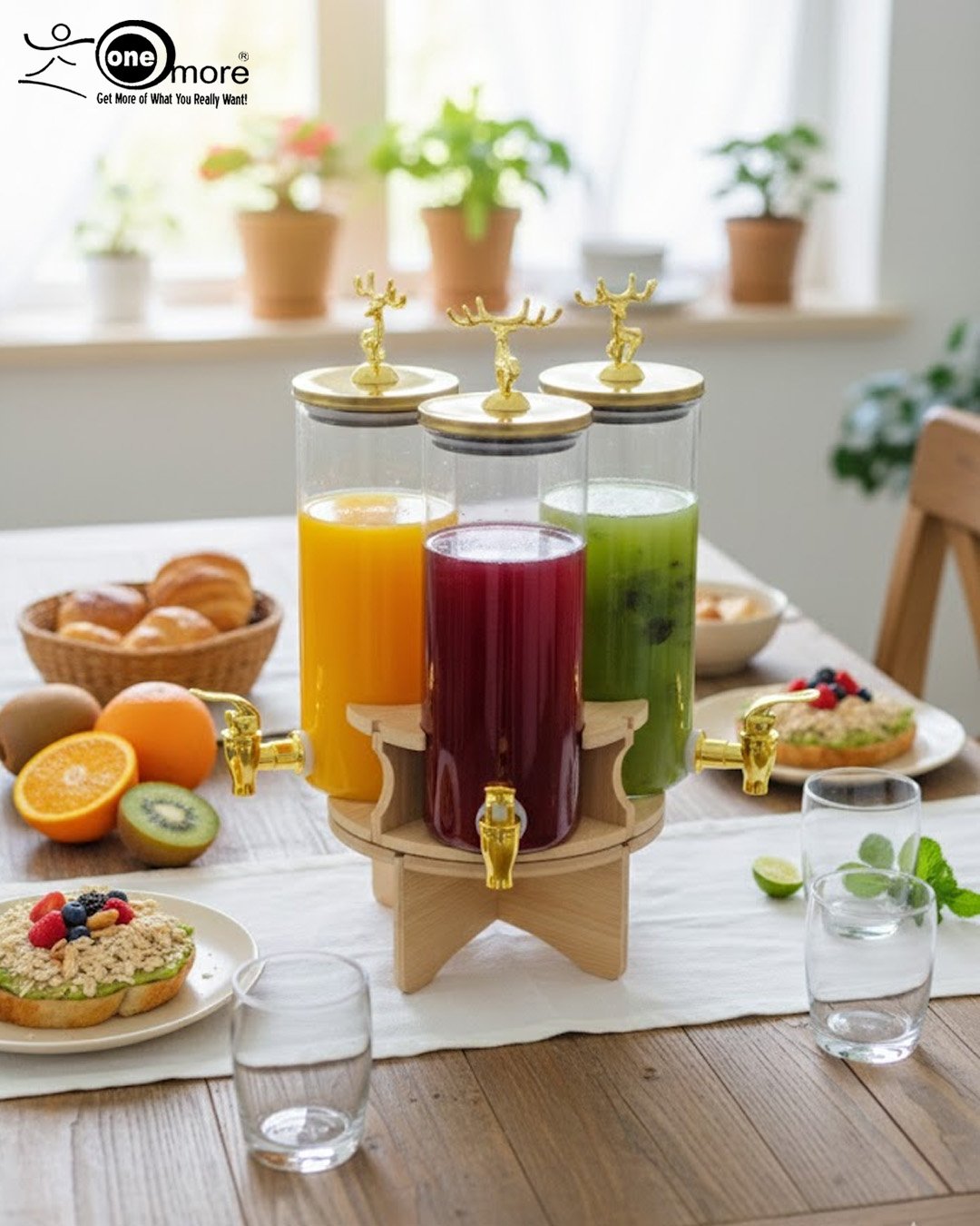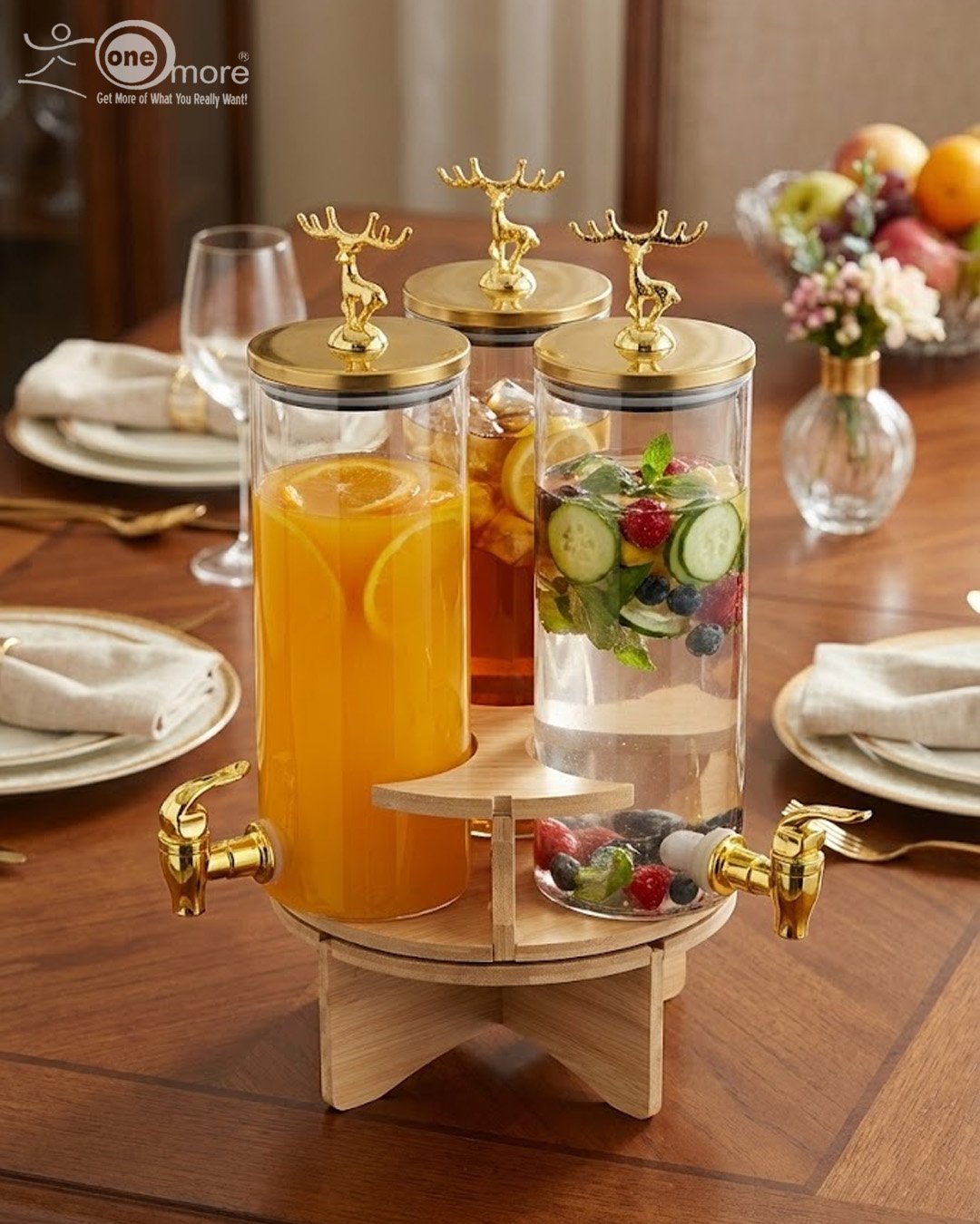 Elevate your hosting experience with this stunning Triple Glass Beverage Dispenser, a perfect blend of rustic charm and modern luxury. With a generous total capacity of 5.5 Liters (1.83L per cylinder), this set allows you to serve a variety of drinks—from fruit-infused water and iced tea to fresh juices—all in one elegant display. The high-quality clear glass cylinders are topped with gold-finished lids featuring decorative deer figurines, adding a sophisticated touch to any setting. Each dispenser is equipped with a smooth-flow gold-tone tap for mess-free pouring. The centerpiece of this design is the 360-degree rotating wooden stand, crafted for stability and convenience, ensuring guests can easily access their favorite drink from any angle. Whether for a garden party, wedding buffet, or daily home use, this dispenser is the ultimate statement piece for “getting more of what you really want.”
