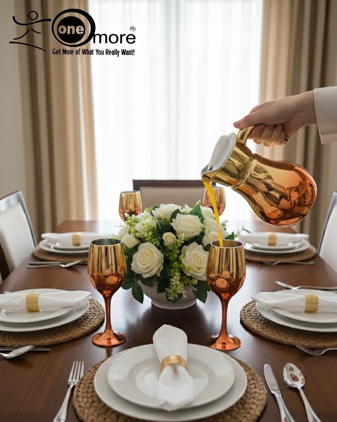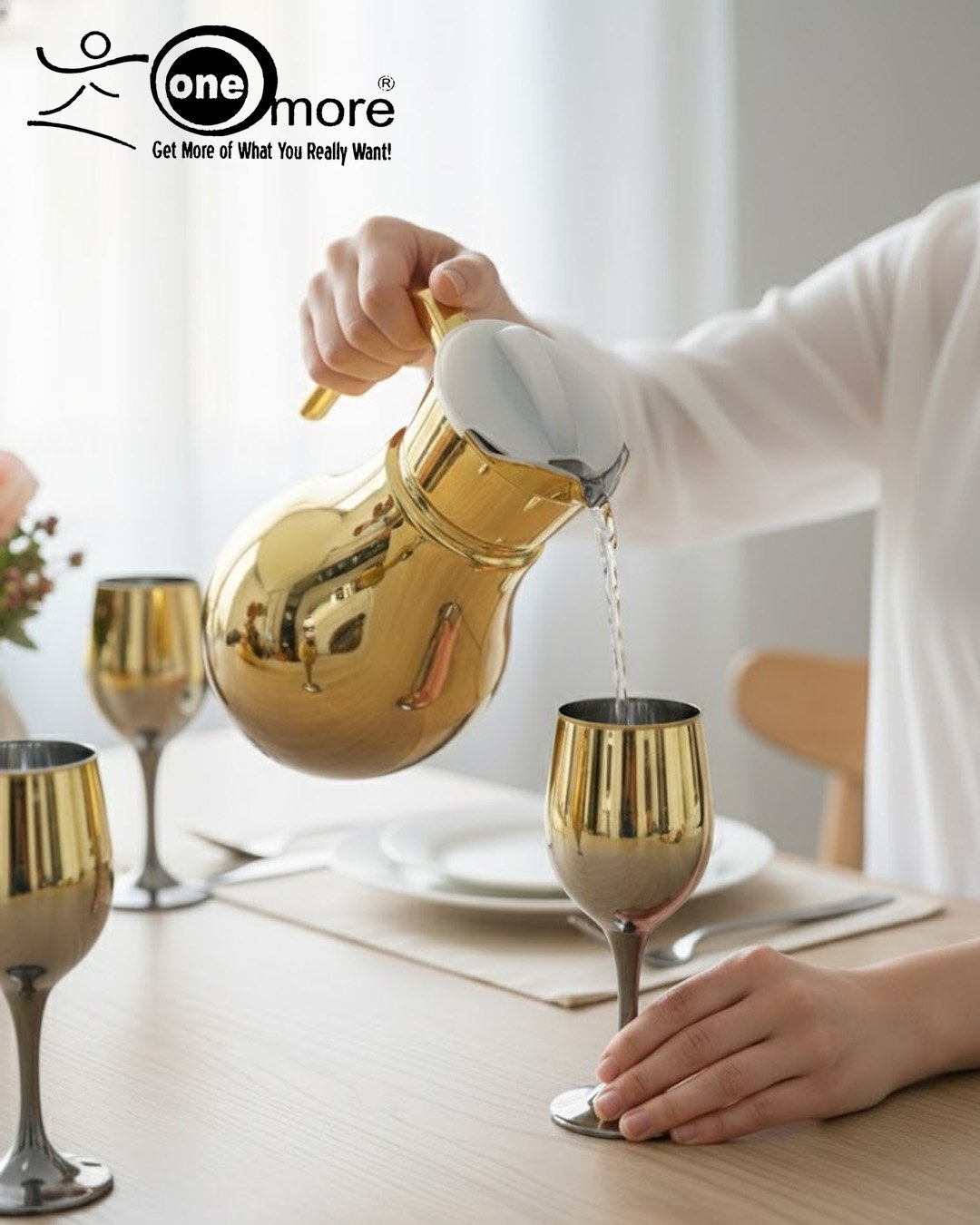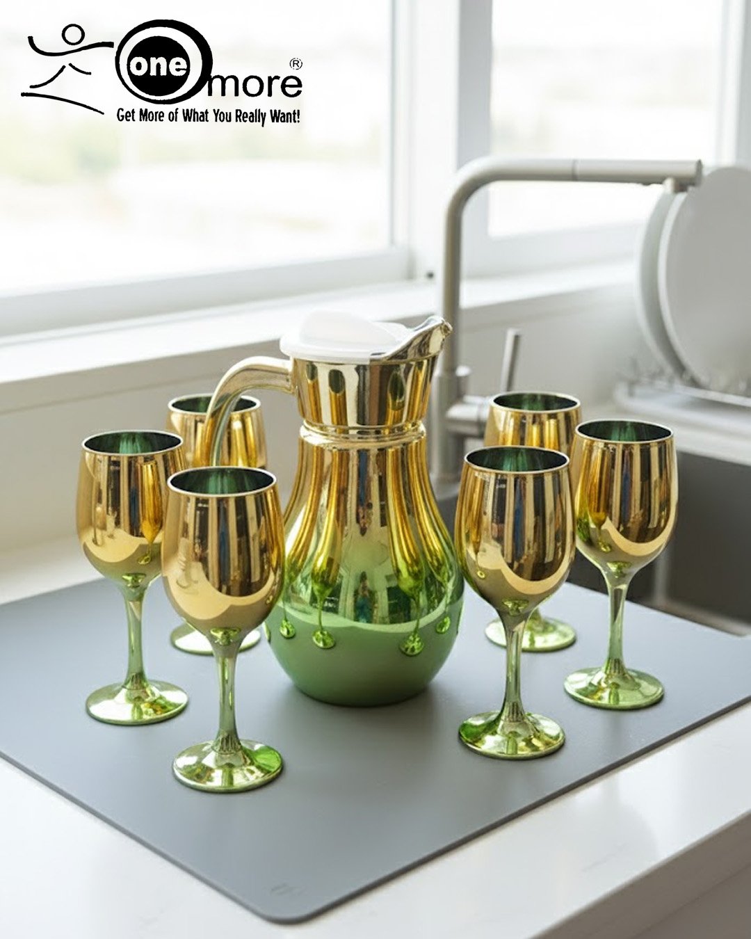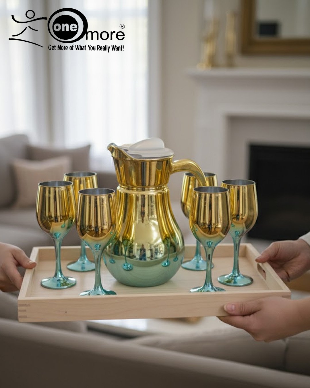 Elevate your entertaining with the dazzling ‘One More’ Water Set. This luxurious set includes one eye-catching water jug (pitcher) and six matching stemmed glasses, all crafted from elegant painted glass.