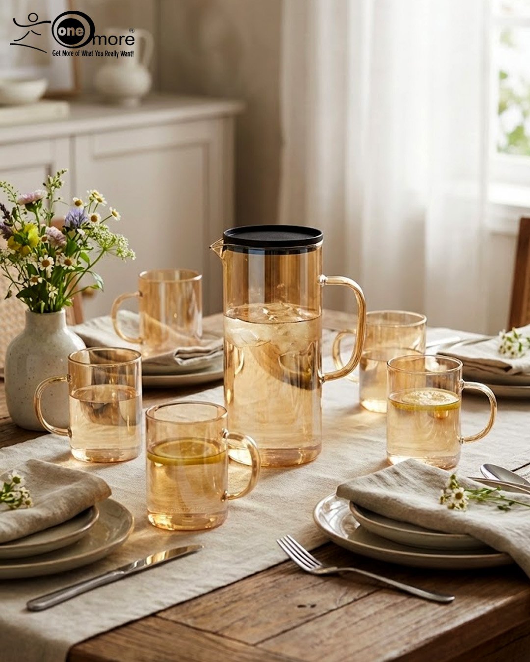This 7-piece amber glass water set features a lightweight, heat-resistant borosilicate design, including a 1.5L pitcher with a black filter lid and 6 matching mugs. Its sleek cylindrical silhouette and warm tint make it a versatile choice for serving both hot and cold beverages in any setting.