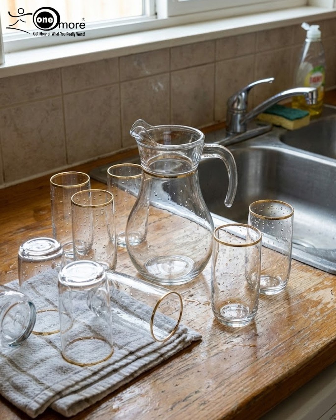 Elegant Design: Features a minimalistic yet striking gold rim on the jug and all six glasses.