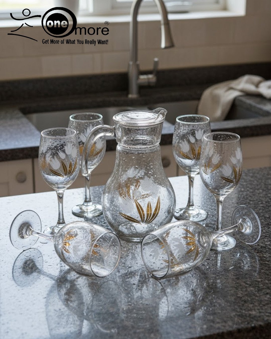 Elevate your entertaining with the exquisite ‘One More’ Glass Water Set. This 7-piece collection, featuring one beautifully crafted glass jug and six matching stemmed glasses, transforms any beverage service into an elegant occasion.