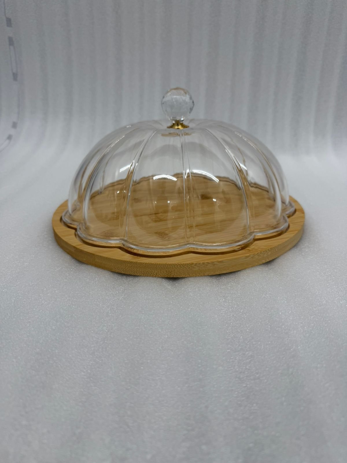 Showcase your delicious bakes with this sophisticated cake dish set. Featuring a warm, natural bamboo base and a crystal-clear ribbed acrylic dome, this server provides a 360-degree view of your desserts while keeping them fresh. The lightweight, shatterproof lid is topped with an elegant faceted crystal-style knob, making it a perfect centerpiece for both casual tea times and formal celebrations.