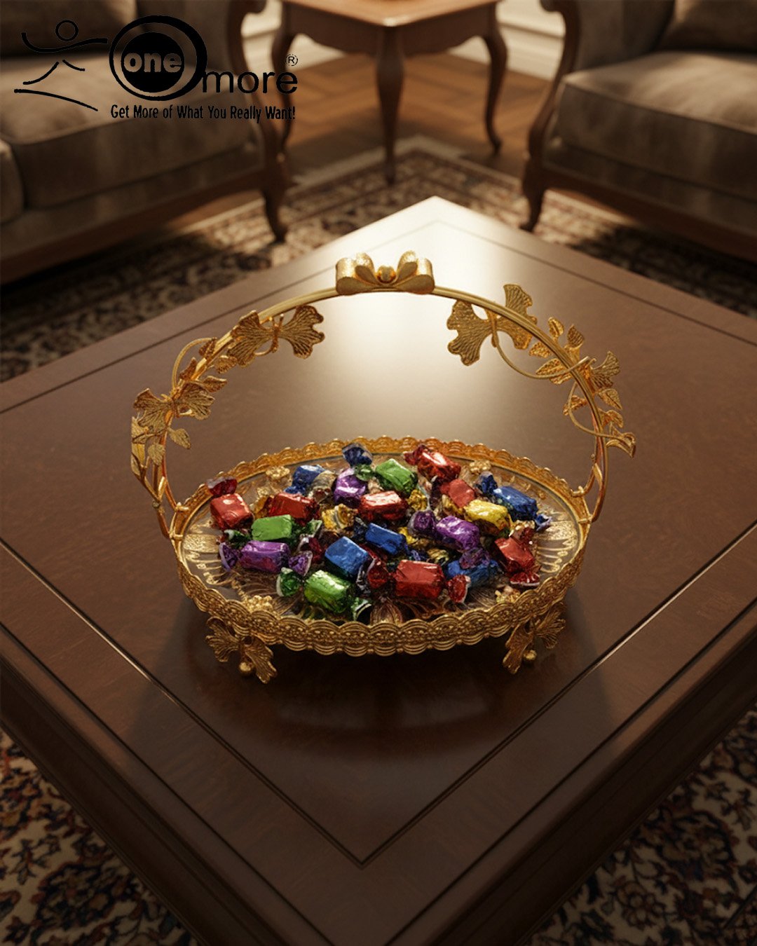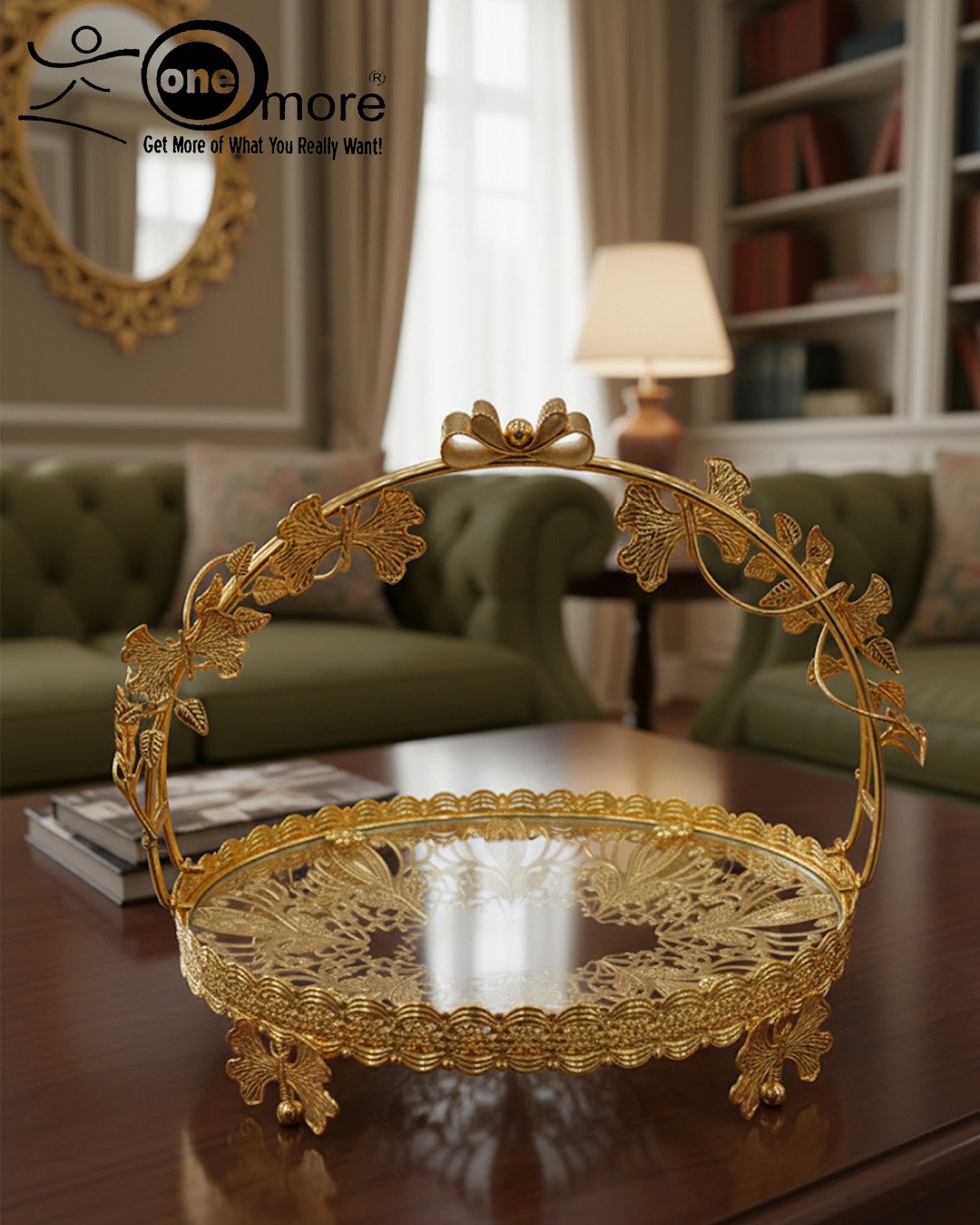 Looking for the perfect luxury serving tray? This elegant, gold-finished decorative basket is a must-have accent piece. Our unique tray is not just a server; it’s a centerpiece. The durable metal frame features a stunning gold butterfly and floral handle design, making it ideal for wedding tables or high-end party decor. The clear, sturdy glass base is etched with a beautiful filigree pattern, beautifully reflecting the light. Use it as a dry fruit serving tray, a sophisticated sweets display basket, or an opulent vanity tray for your perfumes. Invest in quality gold-plated home accessories that stand out.