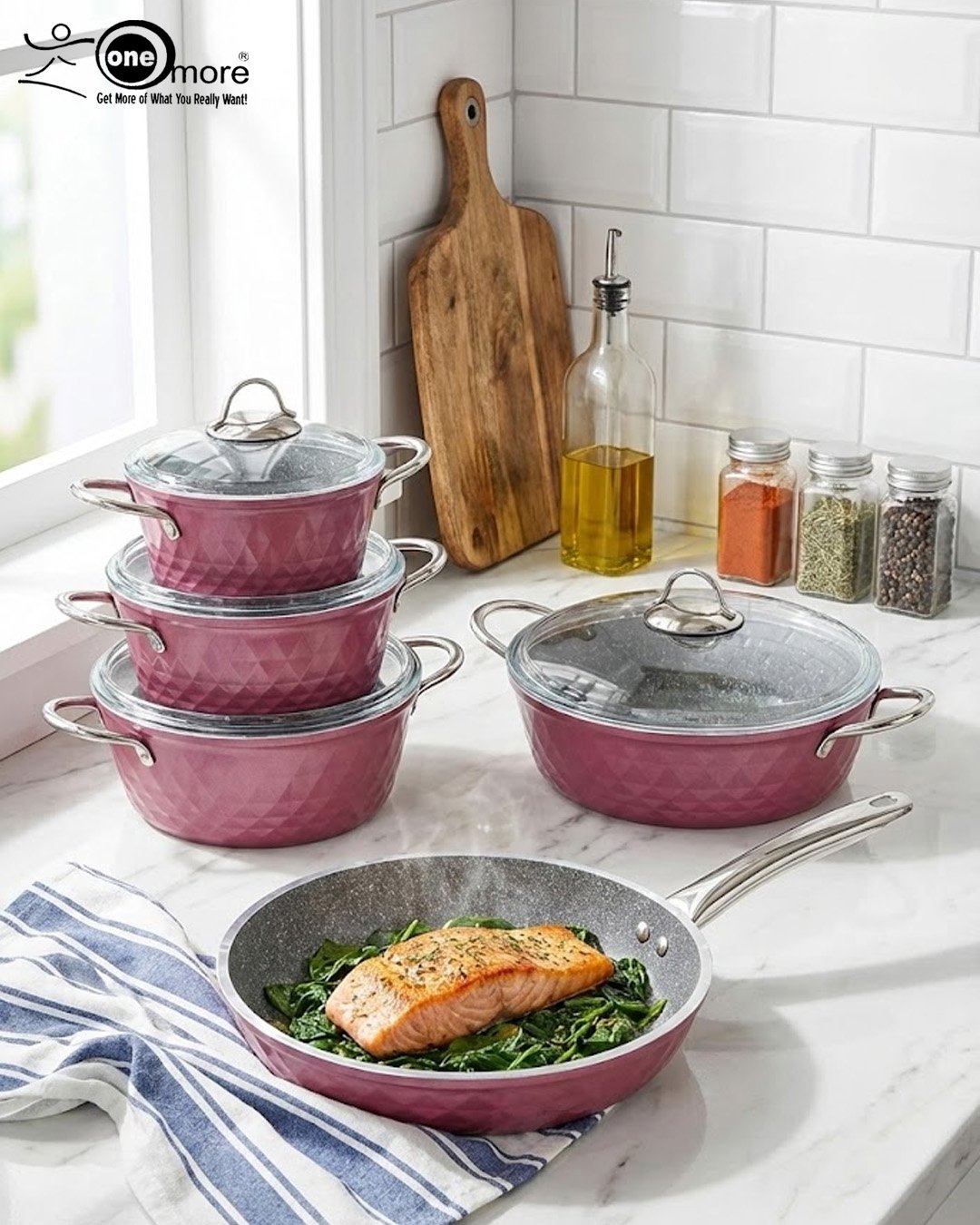 Elevate your culinary experience with the Falez 9-Piece Granite Cookware Set, a masterpiece of Turkish craftsmanship designed for the modern, health-conscious kitchen. This comprehensive set features a stunning, diamond-textured purple exterior that adds a touch of elegance to any stovetop. Engineered with advanced granite coating technology, these pots and pans provide a superior non-stick surface that requires 80% less oil than traditional cookware, allowing you to prepare heart-healthy meals without compromising on taste. The set includes three sizes of deep pots, one shallow casserole, and a frying pan, all equipped with durable, tempered glass lids (except the pan) to lock in moisture and flavor. Whether you are searing, simmering, or frying, the Falez set ensures even heat distribution and effortless cleanup.