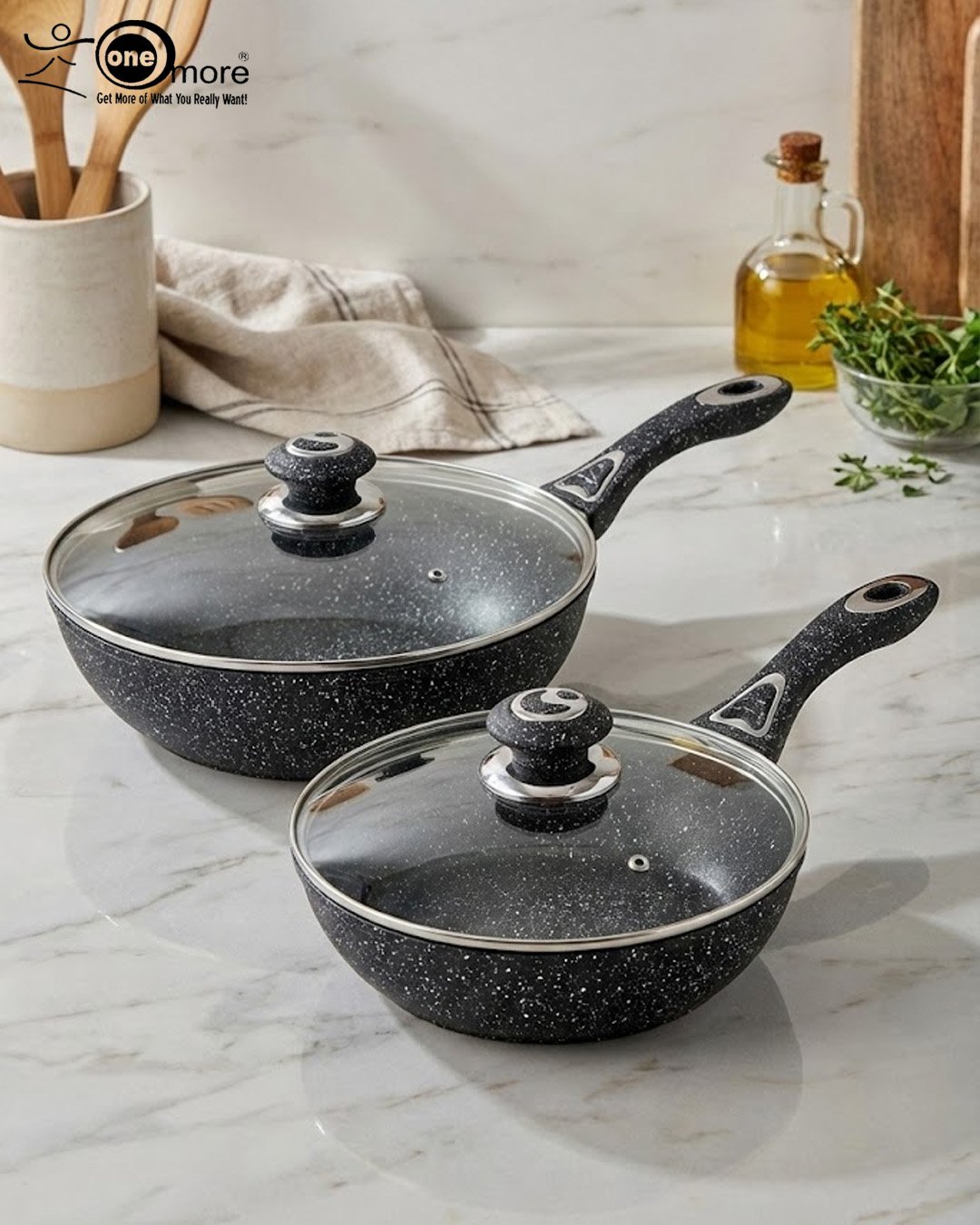 Premium Black Granite Non-Stick Wok Pan with Glass Lid (24cm & 28cm) | Deep Fry Pan by One More