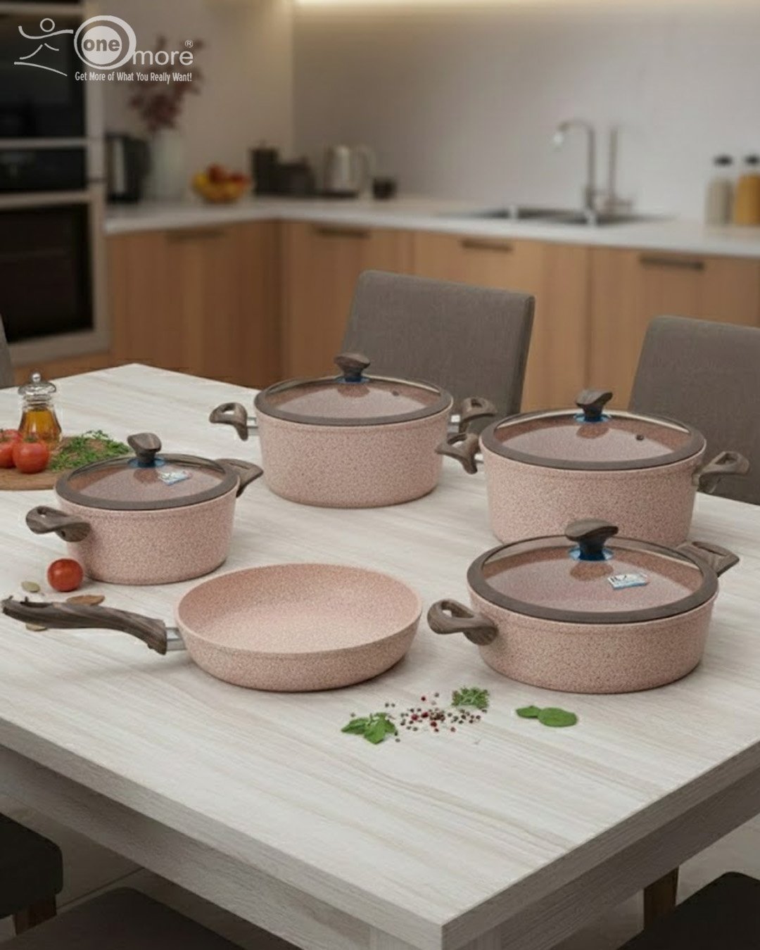 Elevate your culinary experience with the premium Falez 9-Piece Non-Stick Cookware Set, masterfully crafted in Turkey. This elegant set combines the durability of granite with the smooth performance of a ceramic coating, ensuring a superior non-stick surface that requires 90% less oil for healthier, guilt-free meals. Designed for the modern kitchen, the set features ergonomic wood-effect handles that stay cool to the touch and heavy-duty glass lids that lock in moisture and flavor. Whether you are searing, simmering, or slow-cooking, the even heat distribution ensures perfect results every time. The stylish speckled granite finish adds a touch of luxury to your stovetop and dining table.
