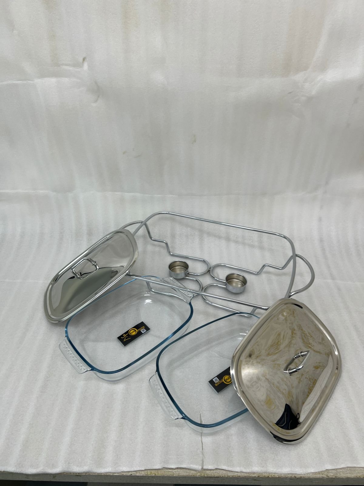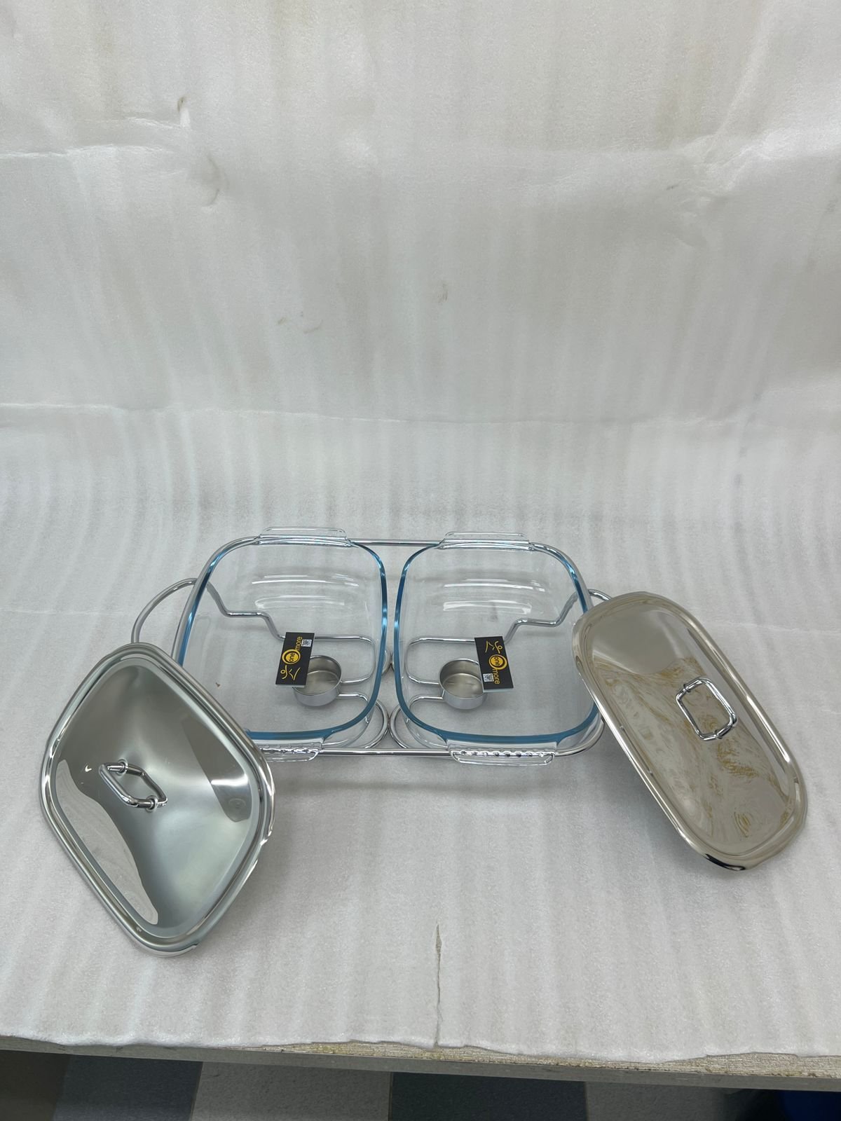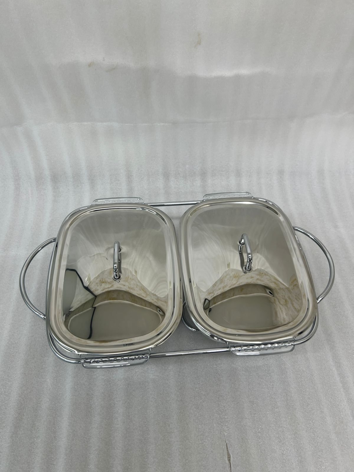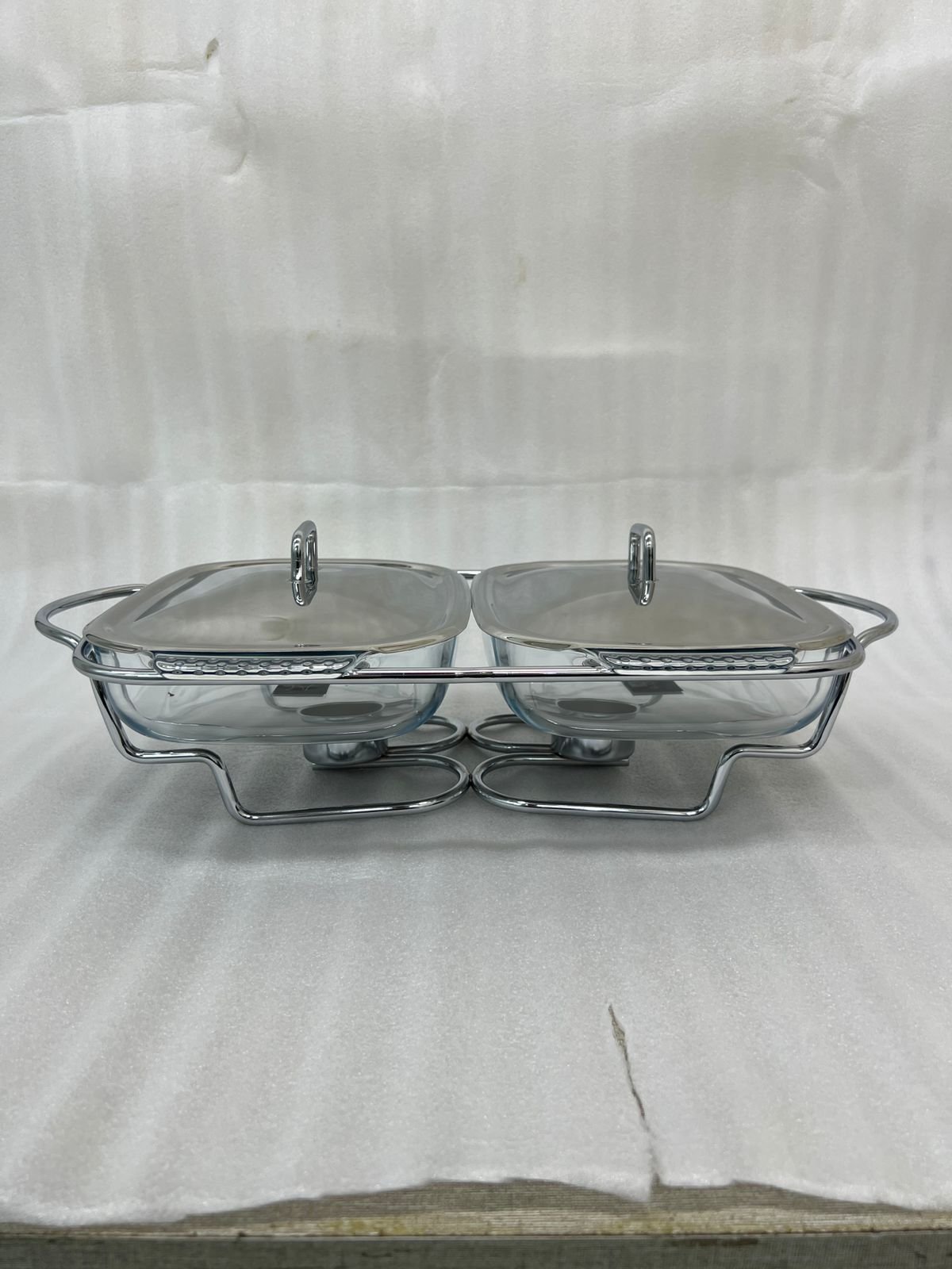 Elevate your hosting experience with the Paramount Series Double Food Warmer, a premium 3-liter total capacity chafing dish set designed for elegance and functionality. This sophisticated server features two heat-resistant glass basins (1.5L each) nestled in a high-grade stainless steel frame with integrated buffet burners. Perfect for dinner parties, weddings, or holiday gatherings, it keeps your signature dishes at the ideal serving temperature using tea light candles or canned heat holders. The durable stainless steel lids lock in moisture and heat, while the ergonomic side handles ensure safe and easy transport from kitchen to table.