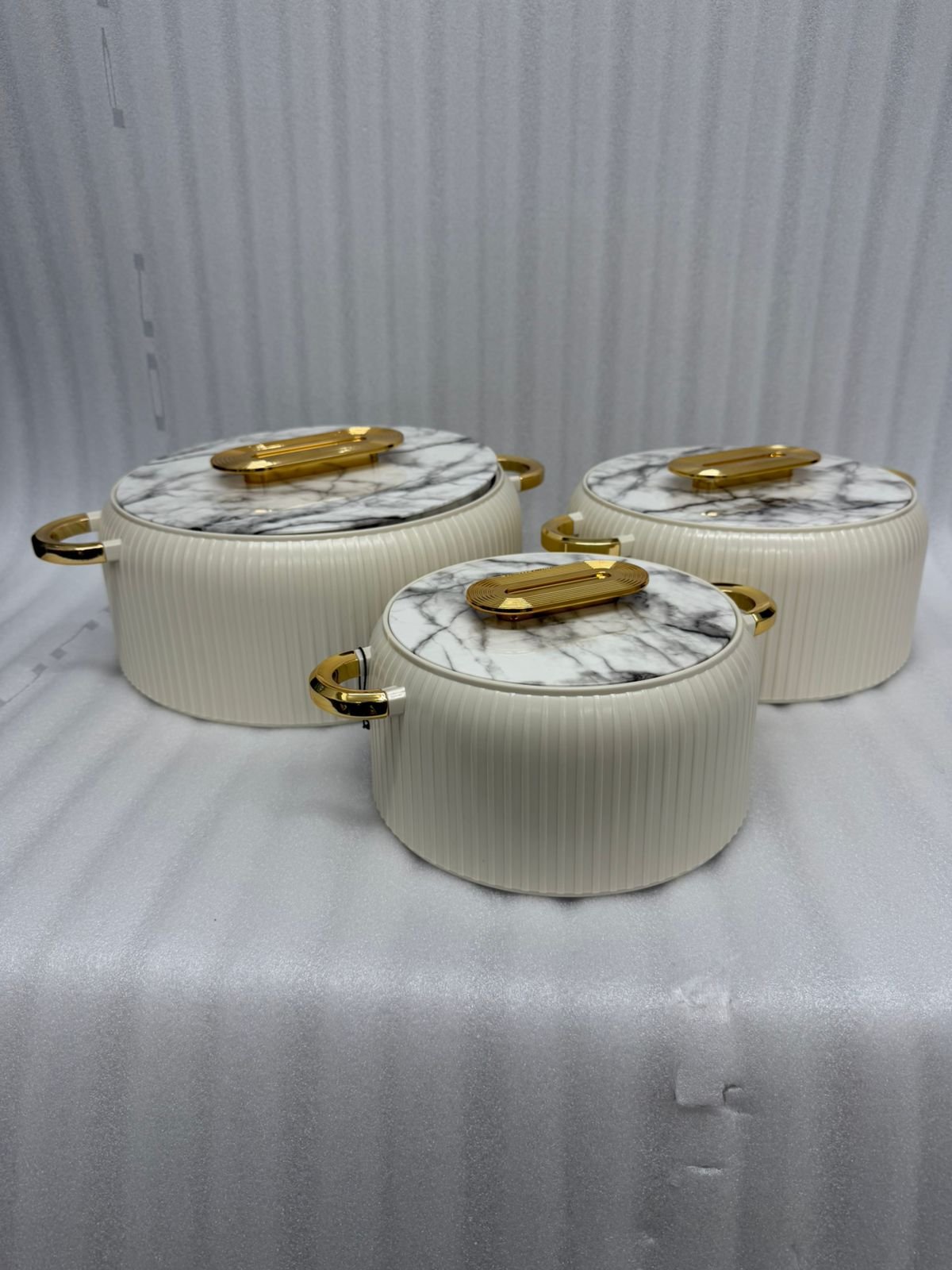 Elevate your dining experience with this premium 3-piece insulated hotpot set. Designed to blend modern aesthetics with functional performance, these casseroles feature a sophisticated ribbed exterior and stunning lids available in marble or wood-grain finishes. Perfect for keeping your meals warm and fresh from the kitchen to the table.