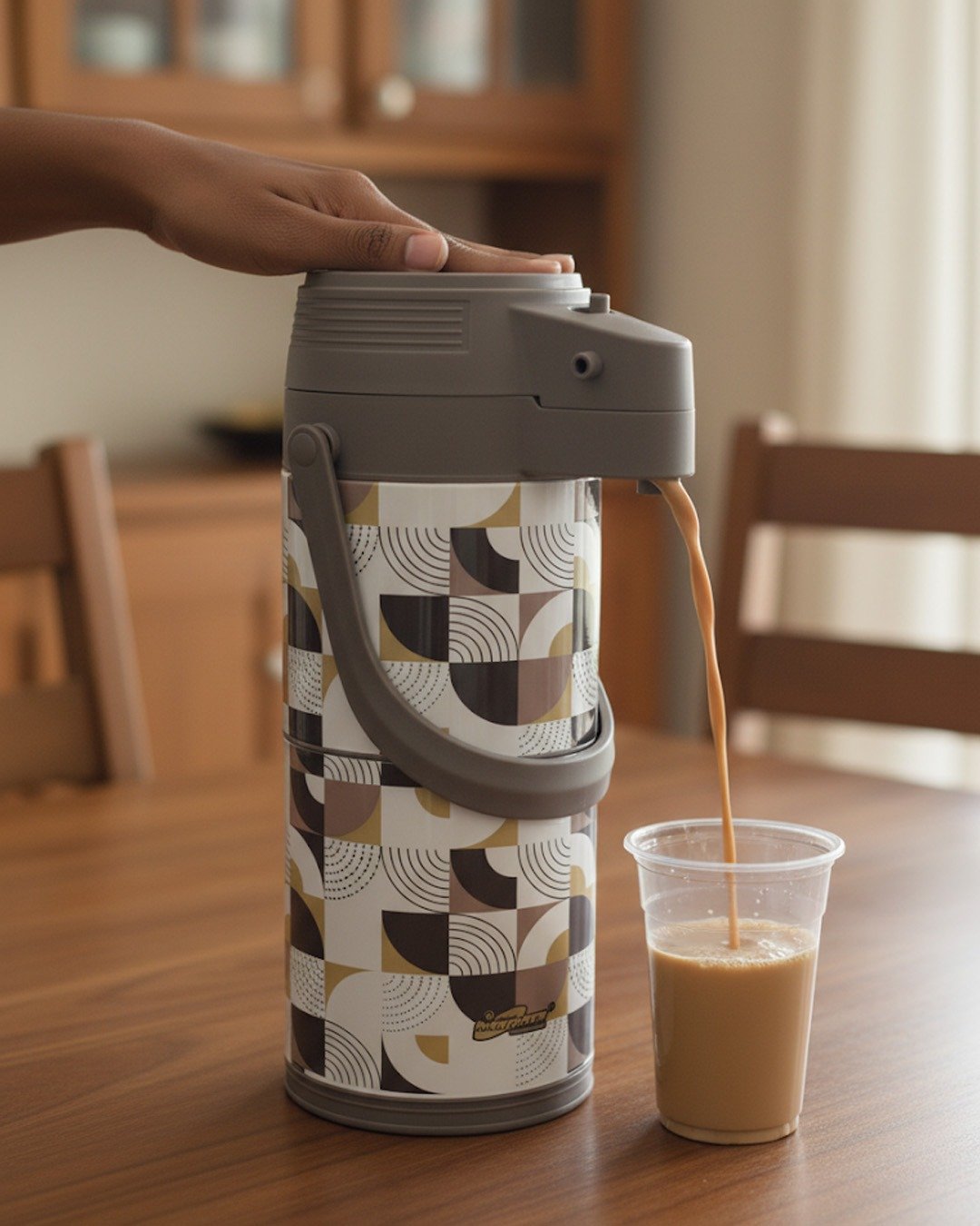 Elevate your beverage service with this stylish 1.9-liter pump-action thermos, designed to blend modern aesthetics with superior functionality. Featuring a chic geometric pattern in earth tones, this thermal airpot is perfect for keeping tea, coffee, or hot water at the ideal temperature for hours. The high-quality glass inner liner ensures excellent heat retention and preserves the authentic taste of your drinks, while the sturdy handle makes it easy to carry from the kitchen to the dining table or outdoor picnics. Whether for daily home use, office meetings, or high-tea gatherings, this dispenser offers a convenient “push-then-pour” mechanism for effortless serving.