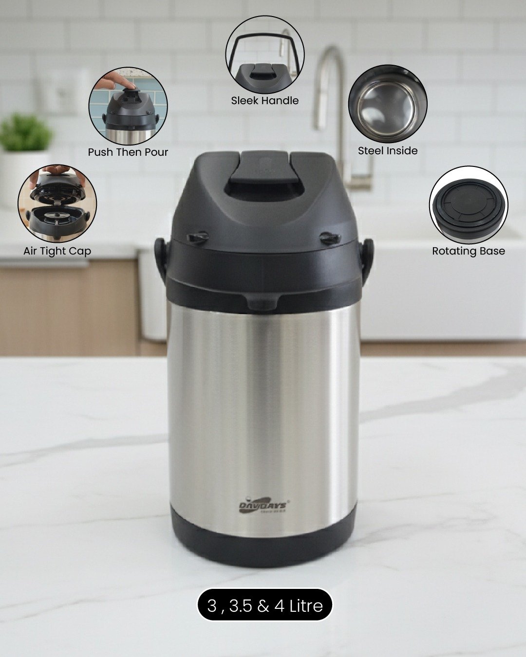 Premium Stainless Steel Airpot Thermos – Vacuum Insulated Pump Flask with Rotating Base for Coffee & Tea (Available in 3L, 3.5L & 4L)