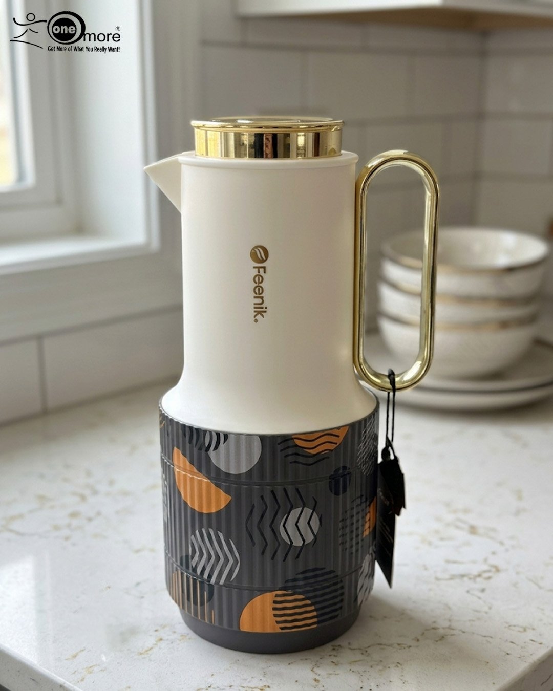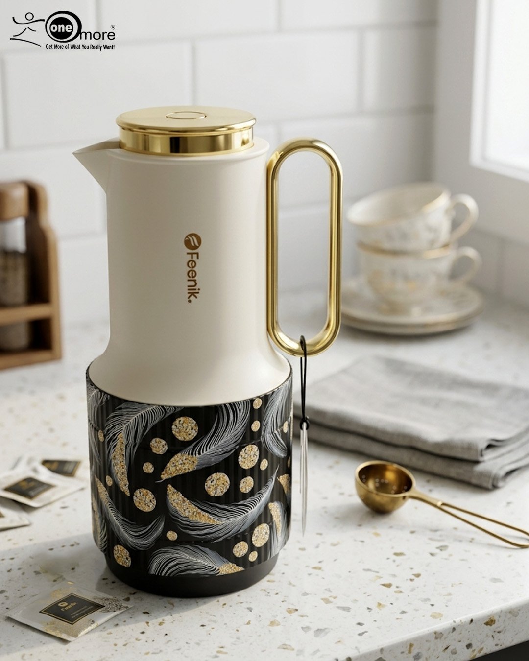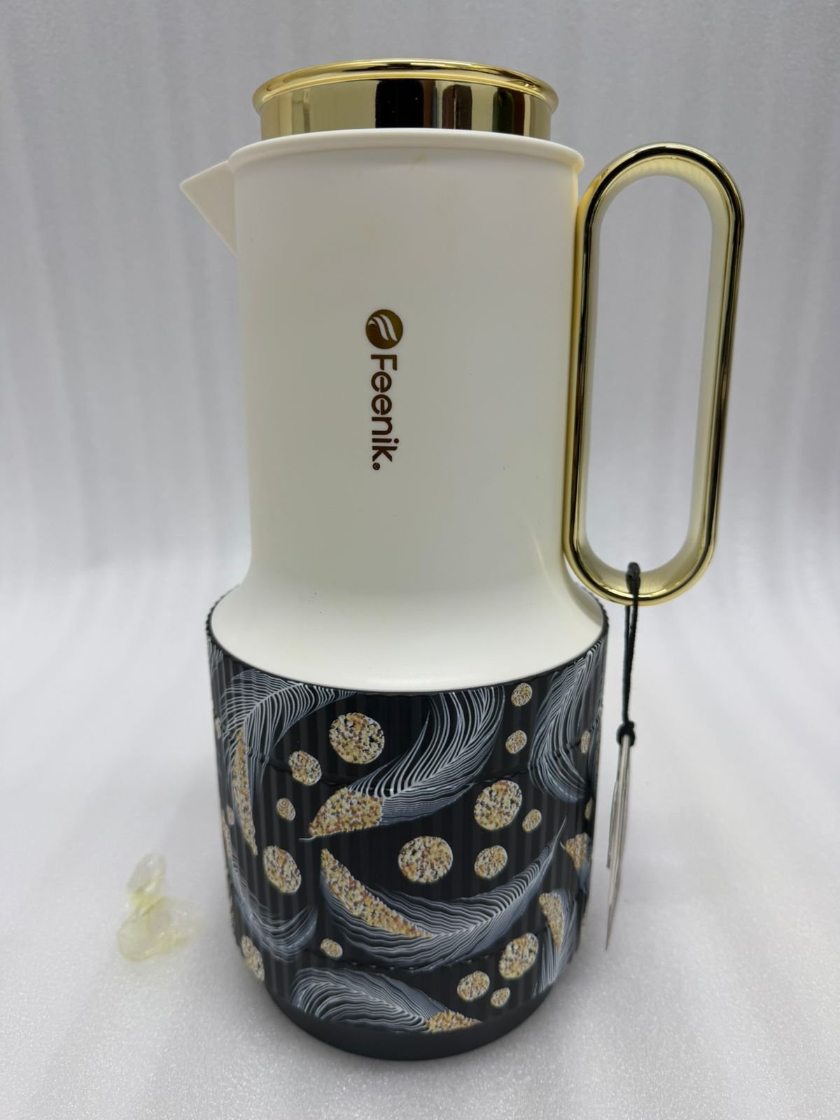 Elevate your beverage service with the Feenik 1 Liter Luxury Thermal Flask, a perfect blend of modern aesthetics and high-performance insulation. Designed for those who appreciate elegance, this flask features a sleek cream-colored body accented by a stunning gold-finished handle and lid. The lower half is adorned with sophisticated, artistic patterns—ranging from cosmic feathers to contemporary geometric shapes—making it a statement piece for any kitchen counter, office desk, or brunch spread.