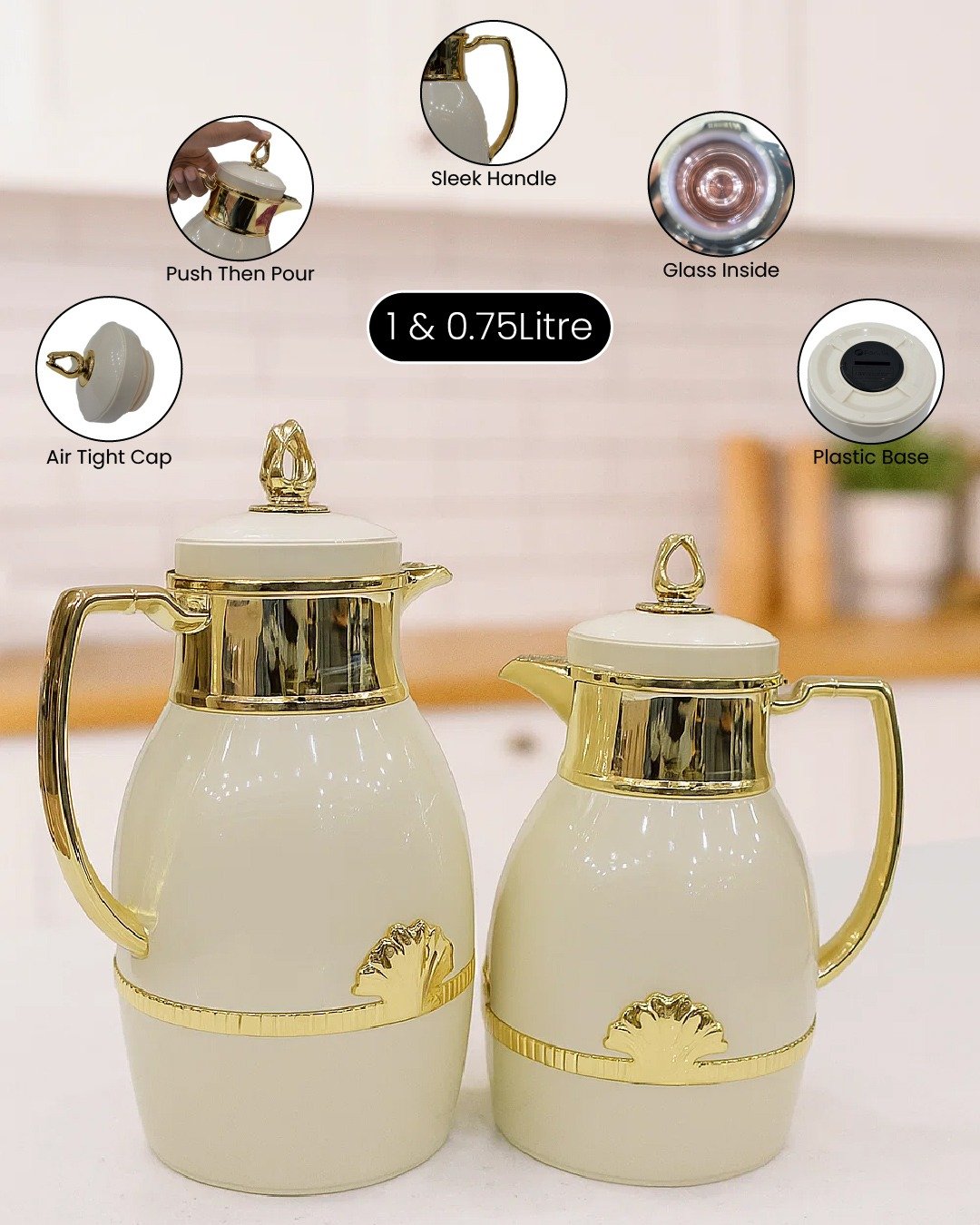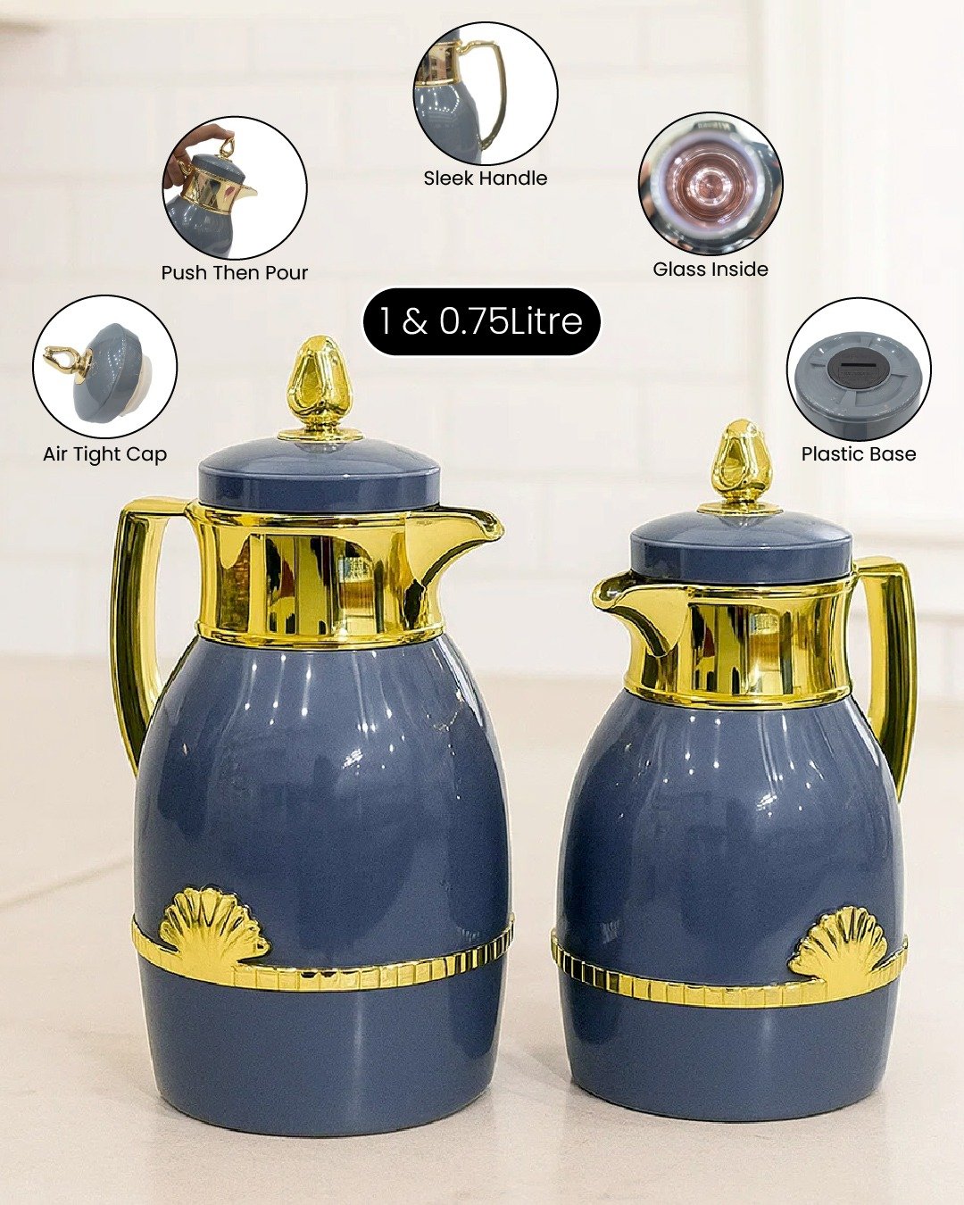 Add elegance and practicality to your tea or coffee service with our Luxury Thermal Flask Set, available in two stylish color options – Ivory White and Royal Blue. This set includes 1 Litre and 0.75 Litre capacities, perfect for serving guests or everyday use.