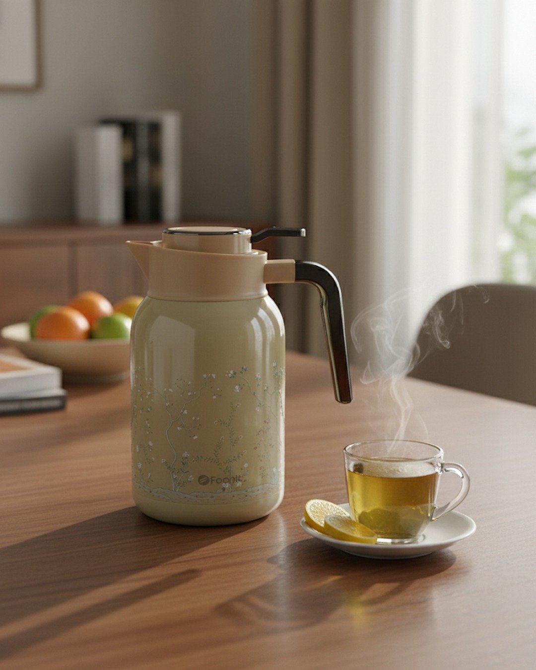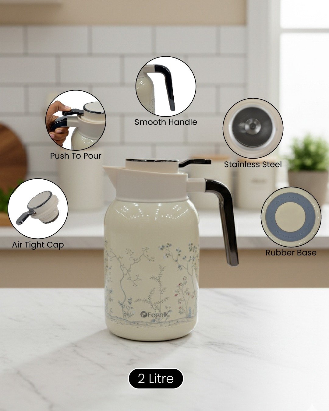 Elevate your serving experience with this elegant 2-Litre Feenik Vacuum Flask, featuring a delicate floral aesthetic perfect for any dining table or guest setting. Designed with a high-grade stainless steel interior, this thermos ensures your beverages stay piping hot or refreshing cold for hours. The ergonomic design includes a smooth handle for easy lifting and a “Push to Pour” mechanism that prevents spills and locks in temperature. Whether you choose the soothing Green or the classic White, this flask combines beauty with practicality, featuring an air-tight cap and a non-slip rubber base for added stability on kitchen counters.
