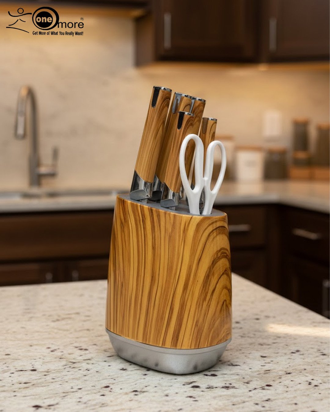 Universal Storage Block: A compact, matching wood-grain block with a weighted silver base for stability and easy access.