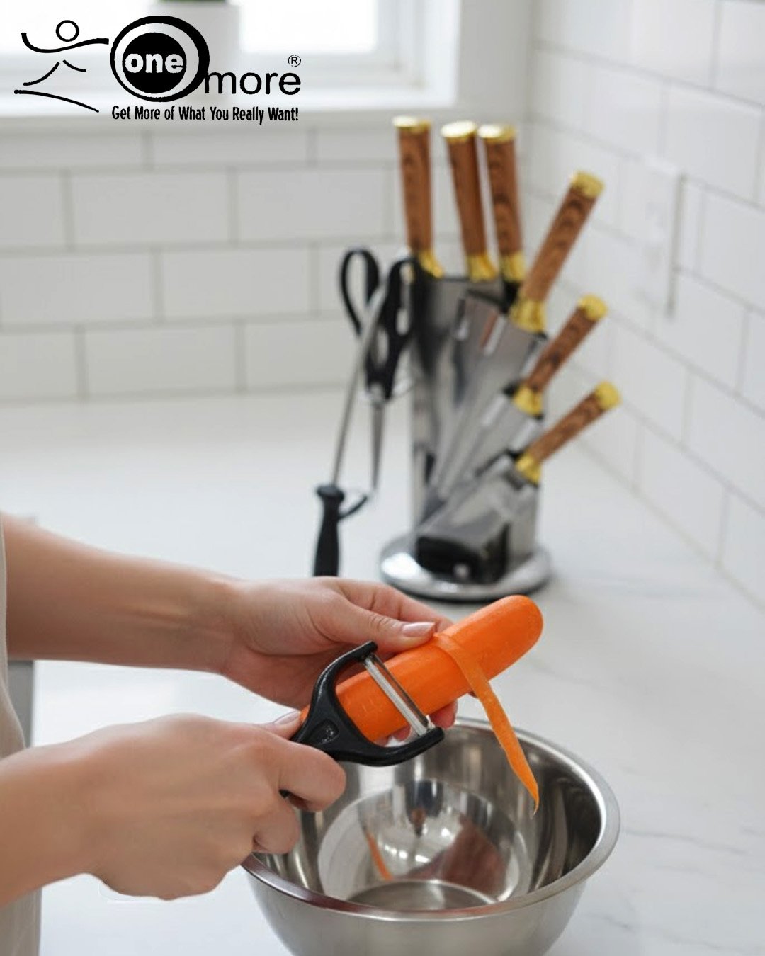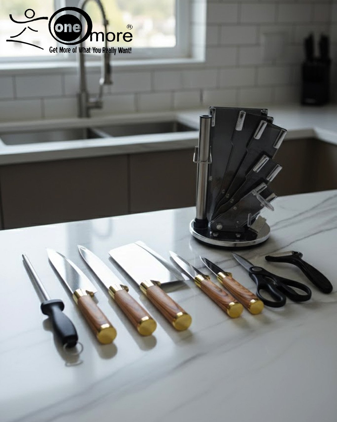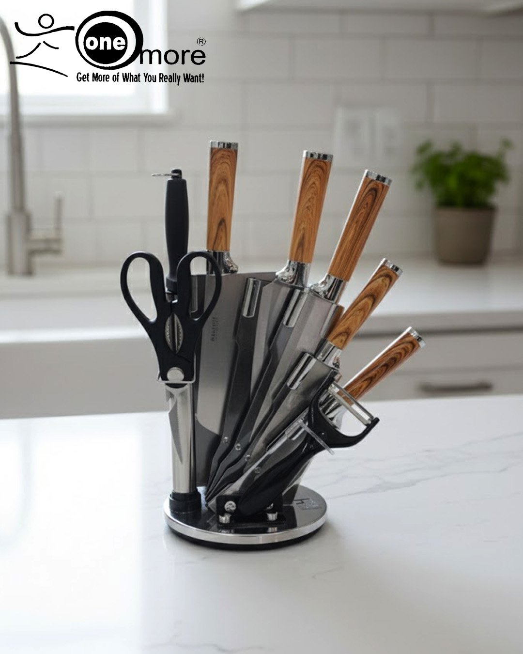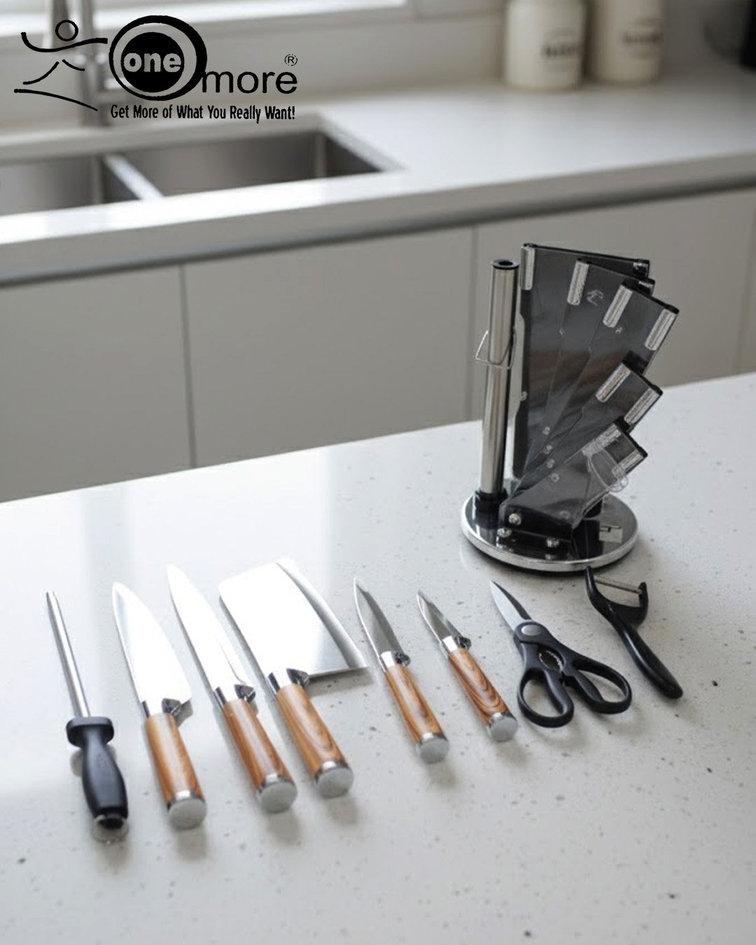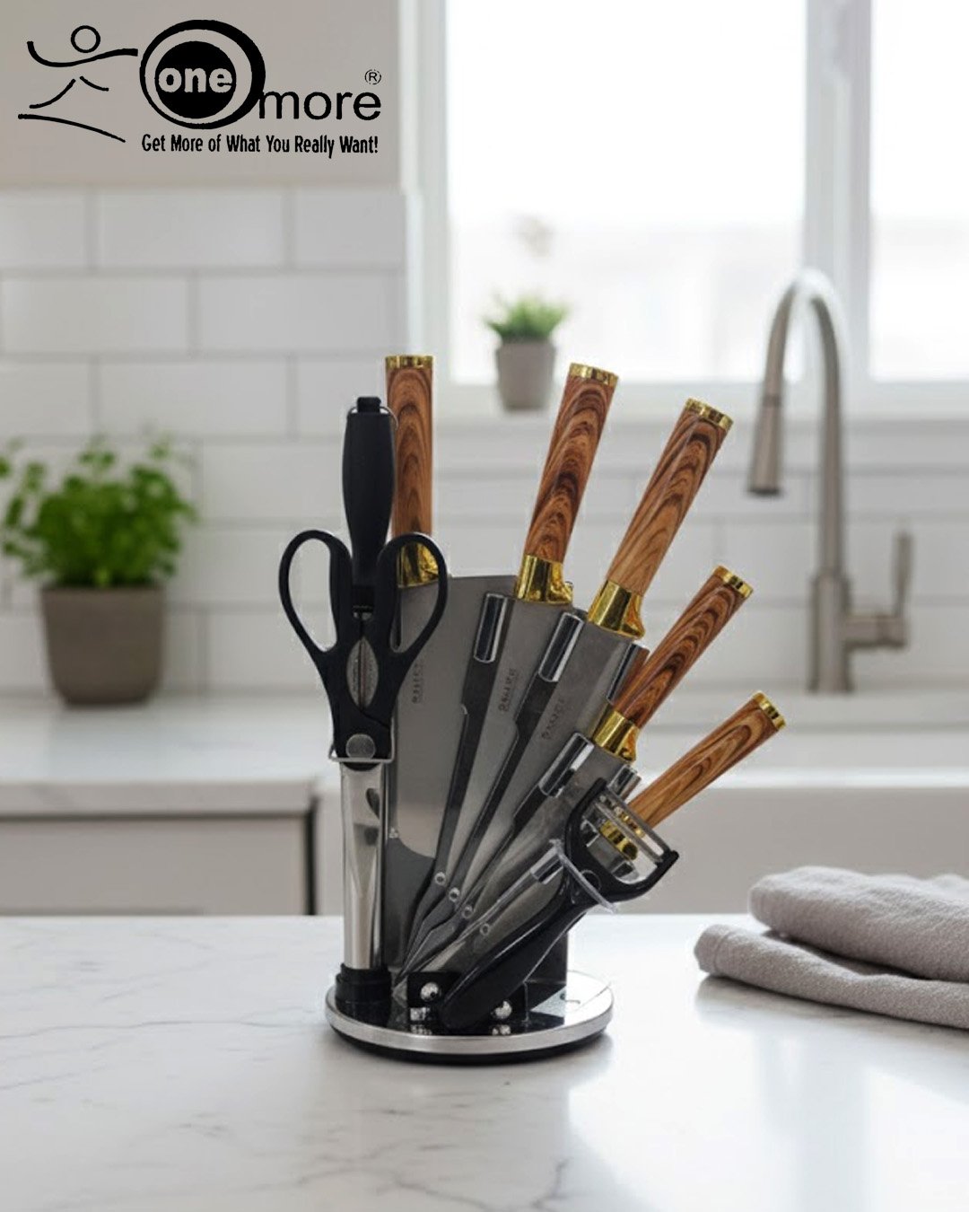 Elevate your kitchen counter with the stunning One More™ 11-Piece Luxury Knife Set. This decorative centerpiece seamlessly blends high-performance functionality with modern elegance. The set features premium stainless steel blades paired with ergonomic black and gold-accented handles, providing a comfortable, secure grip and a luxurious aesthetic. All pieces are neatly stored in a sleek, compact, and 360-degree rotating stainless steel knife block with transparent acrylic slots, making every knife accessible.