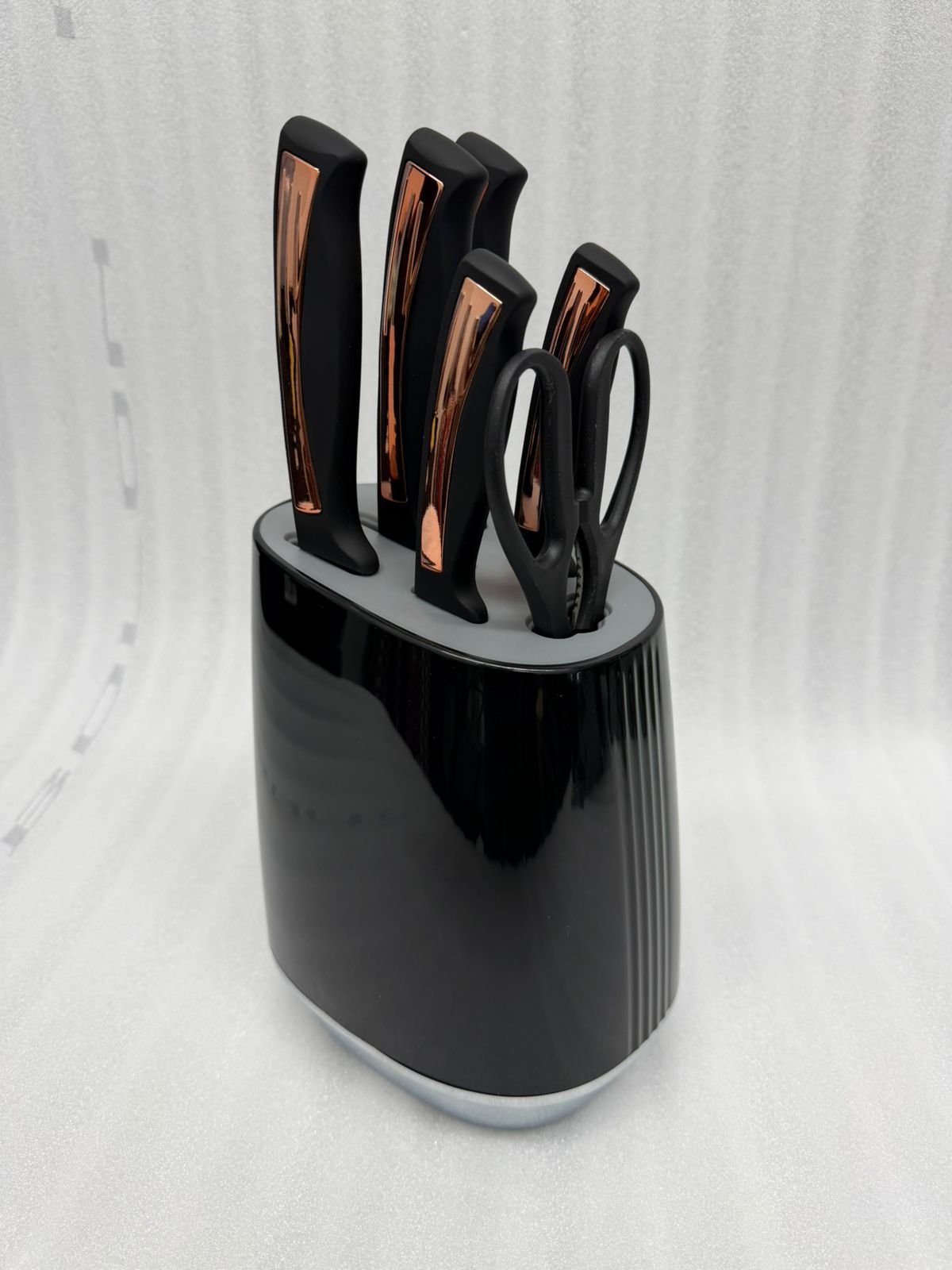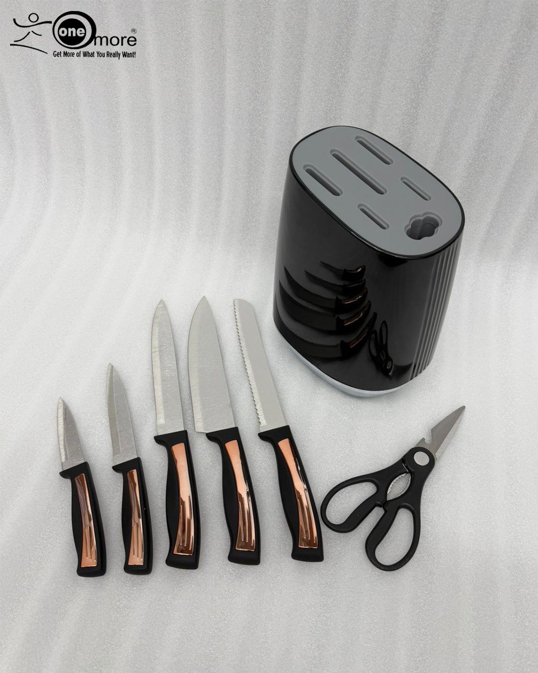 OneMore 7-Piece Knife Set with Elegant Rose Gold & Black Handles and Modern Knife Block