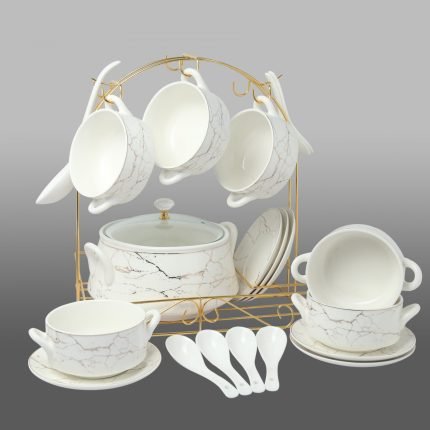 Items In Box : 1 pcs soup tureen with cover – 6 pcs soup bowls – 6 Saucer – 1 pcs big spoon -6 pcs small spoon – 1 pcs Golden stand Made in CHINA