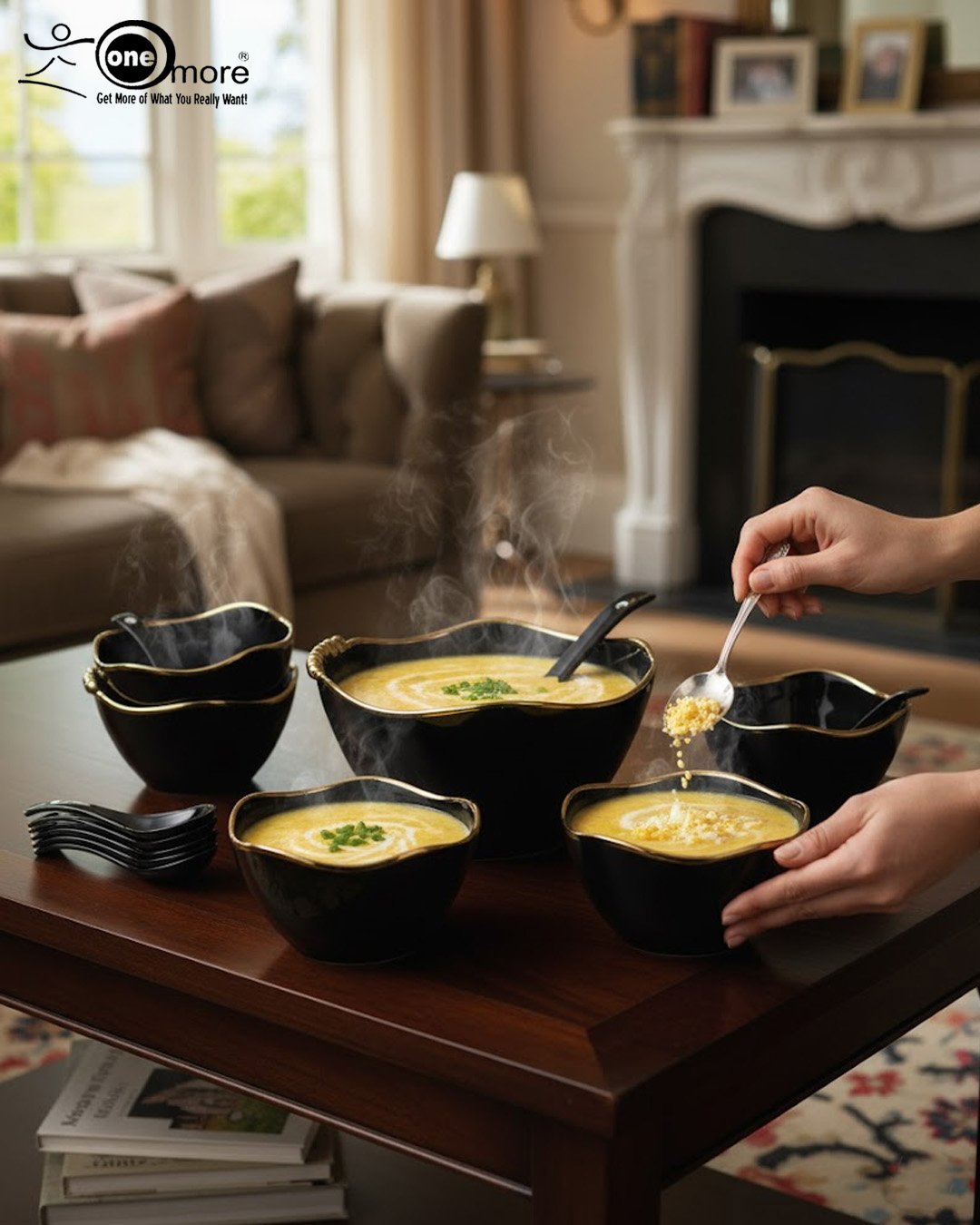 Complete 14-Piece Set: Includes 1 large serving bowl, 6 individual soup/rice bowls, 1 main serving ladle, and 6 matching individual soup spoons.