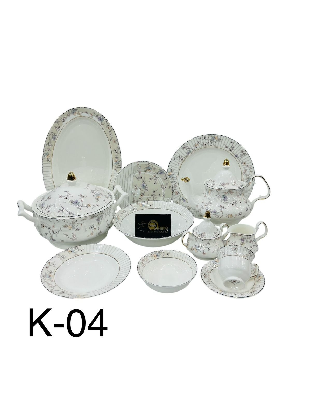 The dinner set features a timeless floral design with soft pastel blossoms and fine vertical detailing on the borders. Crafted with high-quality porcelain, this set includes a complete range of serving dishes, plates, cups, and a teapot. The golden accents on the lids and handles add a luxurious touch, making it perfect for both daily use and special occasions.