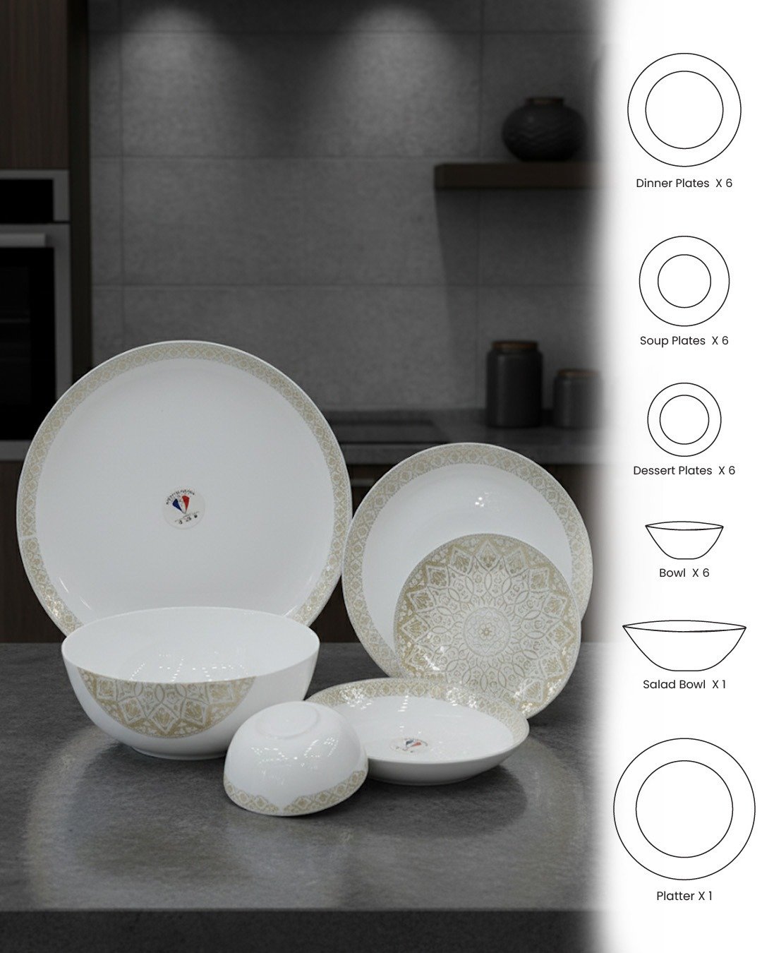 26-Piece Opalware Dinner Set with Elegant Golden/Silver Motif