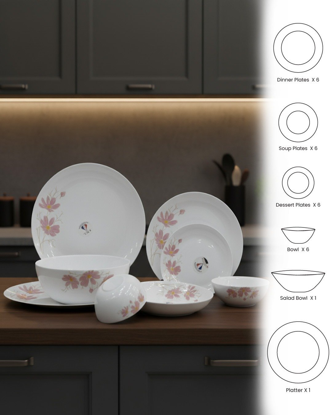 Bring warmth and grace to your table with the 26-piece Blossom Harmony dinnerware set. Adorned with soft pink floral patterns and golden stems, this set creates an inviting and cheerful dining atmosphere. Its delicate design on a crisp white backdrop suits both everyday meals and elegant gatherings.