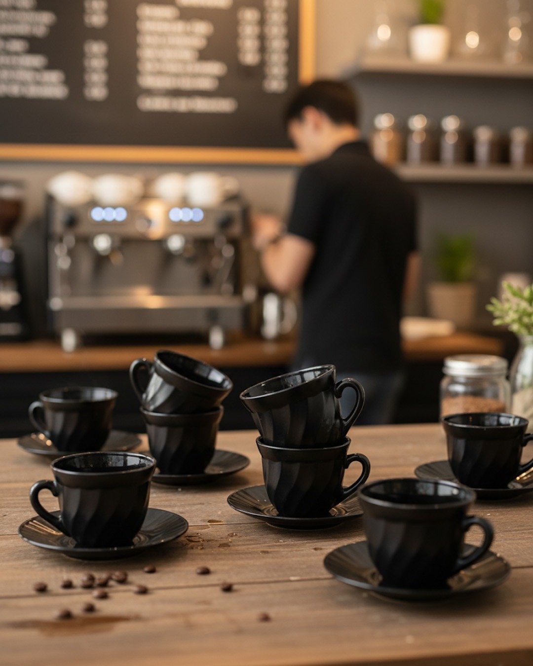 A stylish and compact 38-piece black dinnerware set ideal for families or small gatherings. Presented in a chic kitchen environment, the set includes: