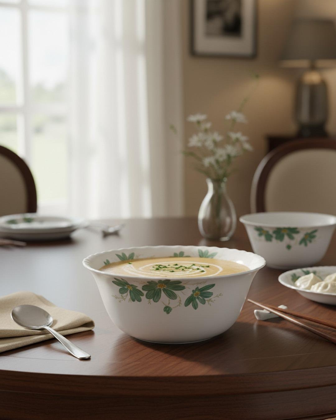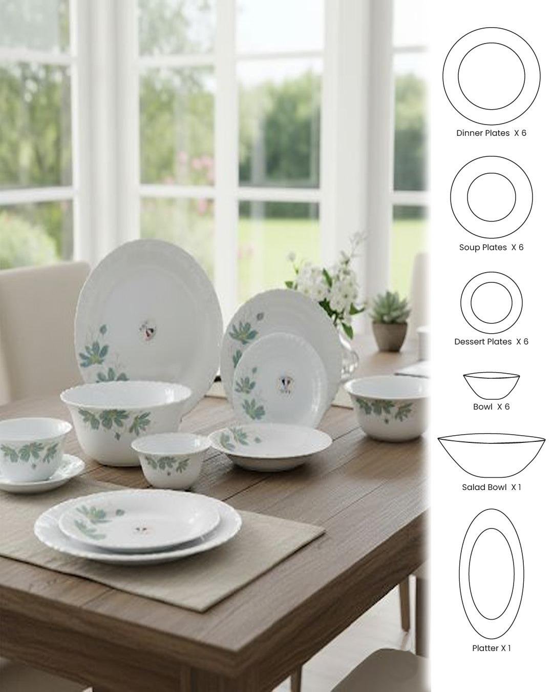 Bring charm and elegance to your dining table with this 26-piece floral-themed white dinnerware set. Adorned with soft green leaf patterns and crafted from premium opal, this set combines timeless style with everyday practicality. Ideal for both casual meals and special gatherings, it’s the perfect addition to any modern or classic kitchen.