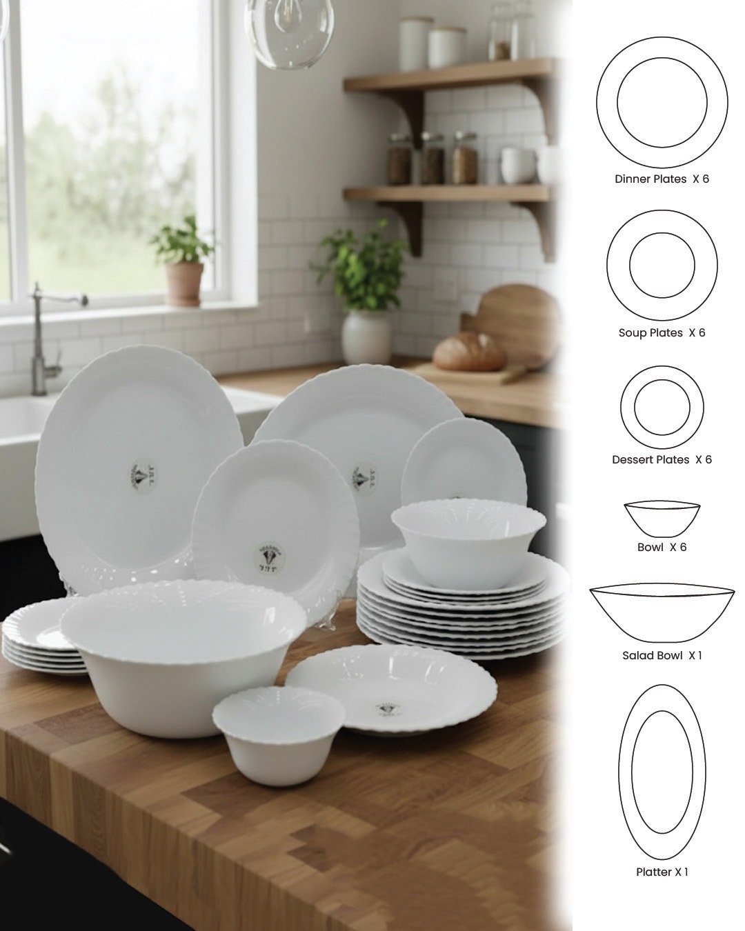 Elevate your dining experience with this beautifully crafted 26-piece white opal dinnerware set. Designed for both everyday meals and special occasions, this set combines elegance, durability, and functionality. Each piece features a timeless white finish with a subtle scalloped edge for a touch of sophistication.