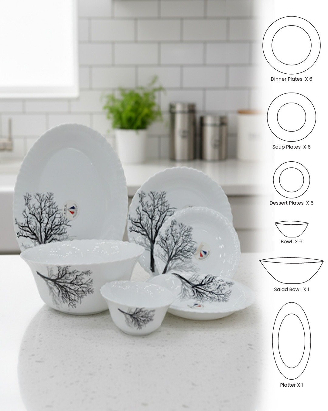 Bring sophistication to your table with the Midnight Tree Opalware Dinner Set, featuring a bold black tree silhouette design on pristine white opal glass. Inspired by nature and styled for modern homes, this dinner set is perfect for those who love minimalist aesthetics with an artistic edge.