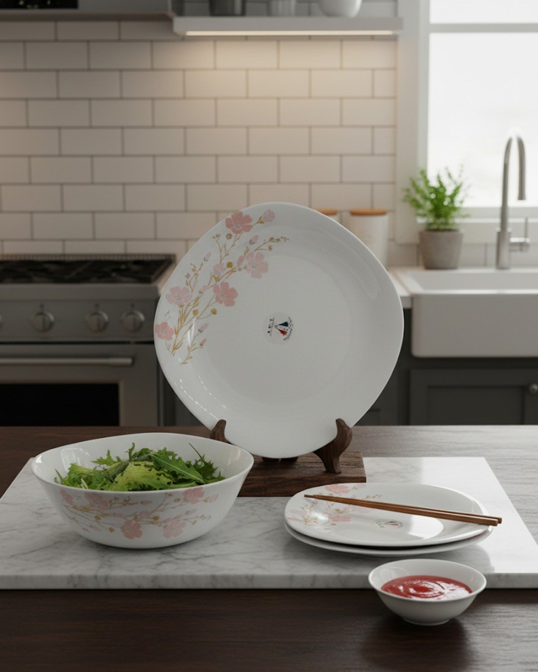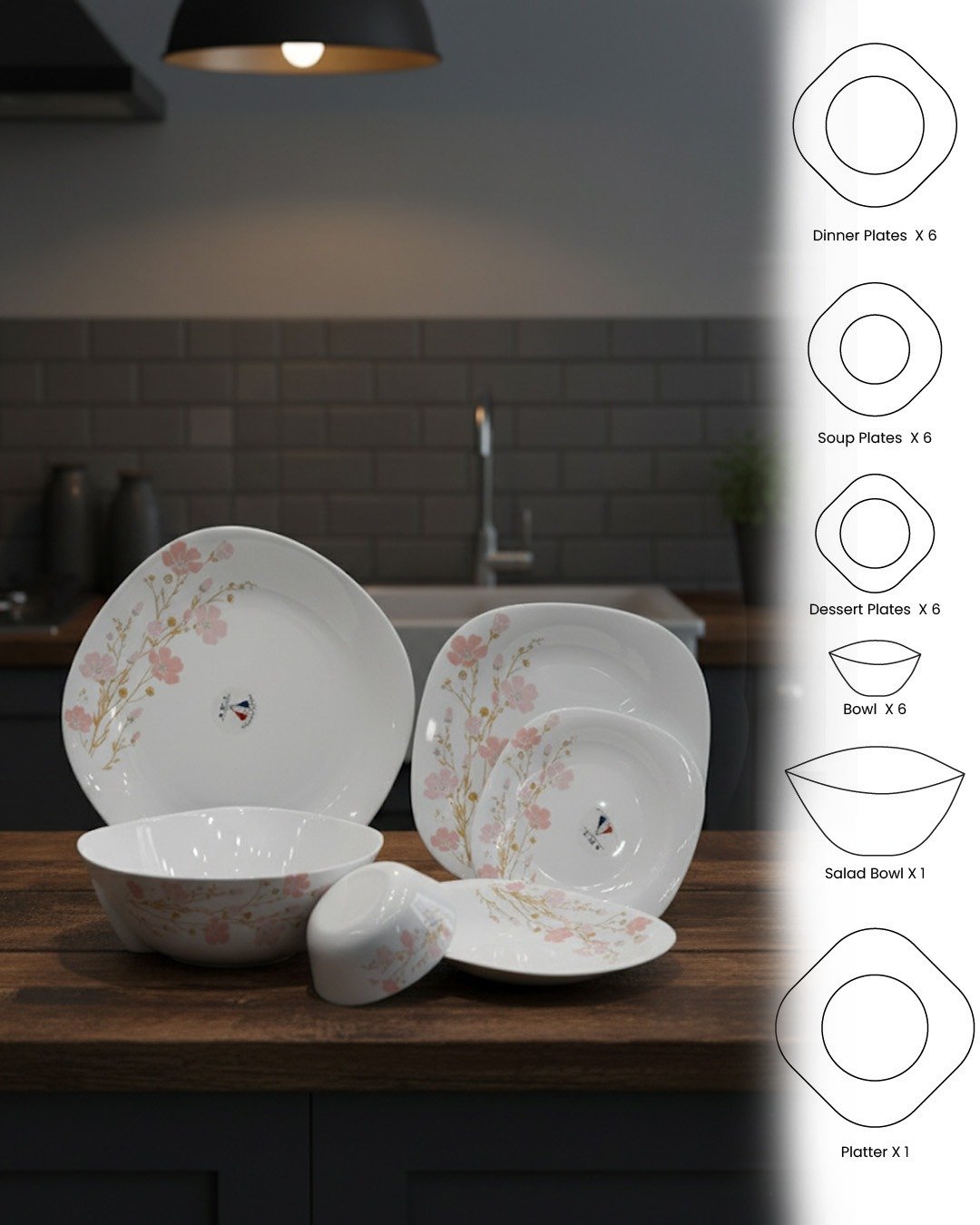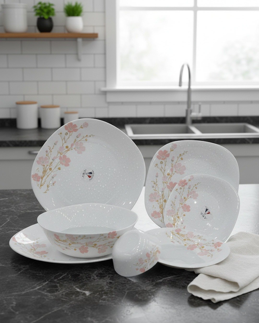 Bring elegance and charm to your dining experience with this 26-piece floral dinnerware set, designed to complement any modern kitchen. Featuring a delicate pink blossom pattern on a soft white background, each piece combines contemporary style with timeless beauty.