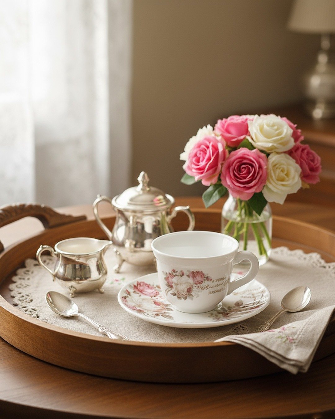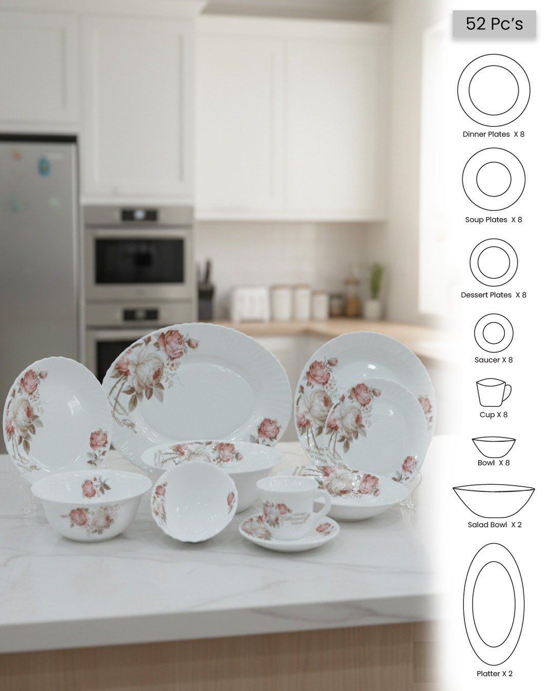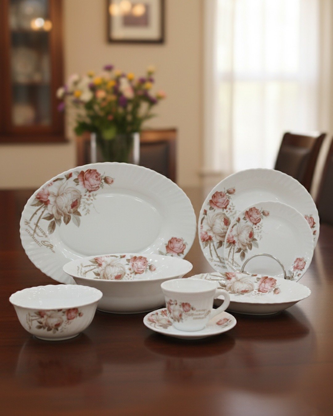 Made from high-quality opal glass, this set is lightweight, durable, and resistant to chips and stains, ensuring long-lasting beauty and functionality. The set includes a mix of plates, bowls, serving platters, and a charming tea cup with a saucer — all adorned with matching rose patterns that enhance the cohesiveness of your table setting.