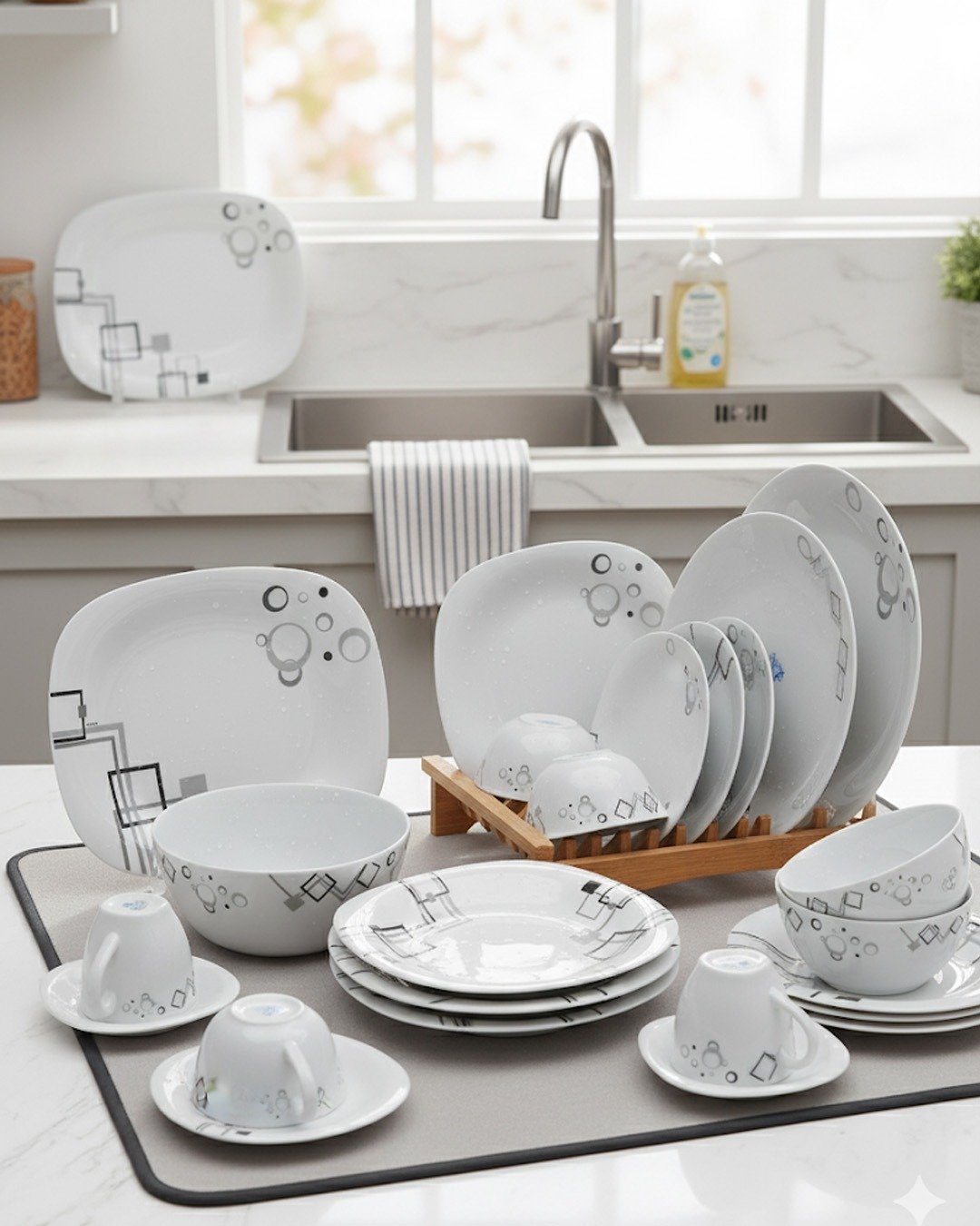 Sophistication meets minimalism with the Urban Geometric Opal Dinnerware Set. Featuring sleek square and circular motifs in black and grey, this 38-piece set is designed to elevate your table with contemporary charm. Crafted from premium opal glass, it’s both practical and stylish for everyday dining.