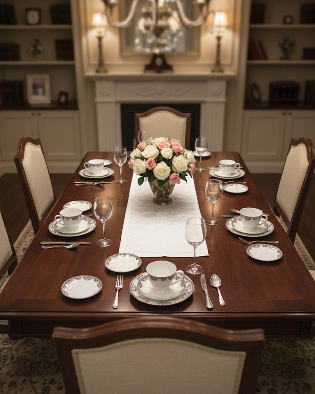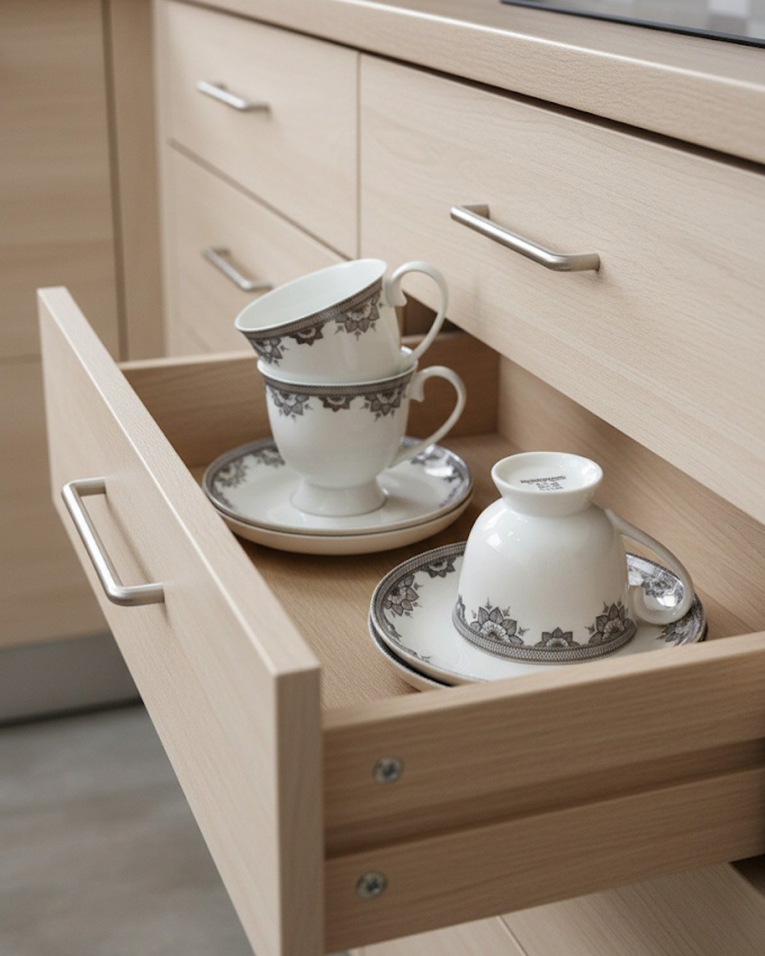 This set of porcelain tea cups and saucers features an elegant grey floral pattern along the rim, adding a timeless charm to their design. Neatly stored in a wooden drawer, the cups showcase both beauty and functionality. Perfect for tea or coffee, they bring sophistication and tradition to any gathering or everyday use.