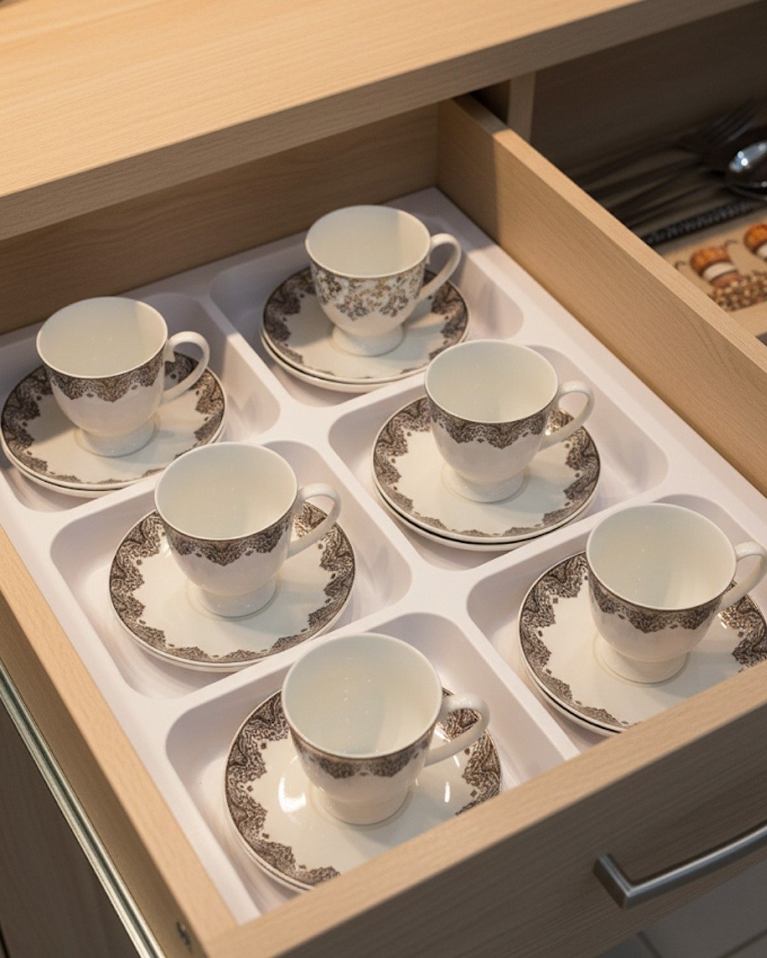 A neatly arranged set of six fine porcelain cups with matching saucers rests inside a wooden drawer, each placed in its own slot for safekeeping. Adorned with elegant floral patterns in soft black detailing, the cups reflect timeless style and sophistication. Perfect for serving tea or coffee, this collection embodies grace, organization, and hospitality — ready to elevate any gathering or special occasion.