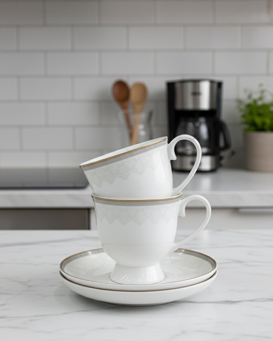 A refined set of white porcelain cups and saucers adorned with delicate silver detailing along the rim. Perfect for serving tea or coffee, this set combines timeless elegance with everyday functionality. Its classic design makes it suitable for both casual gatherings and formal occasions, adding a touch of sophistication to your table setting.