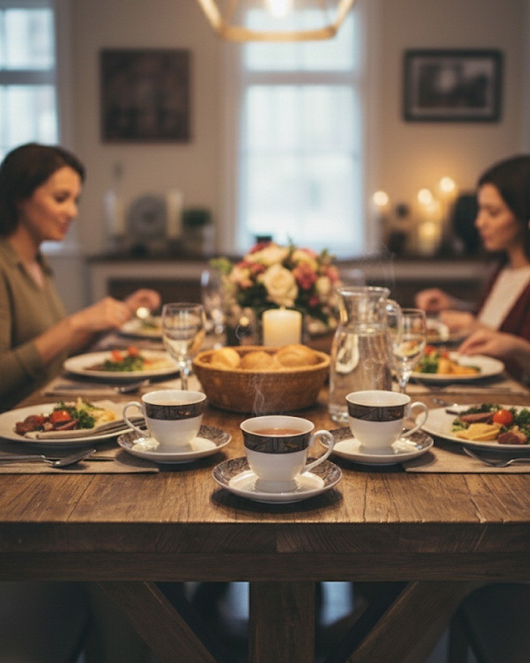 A pair of finely designed porcelain cups with matching saucers is neatly stacked in a kitchen cabinet. The cups feature a striking metallic gray and gold pattern along the rim, giving them a modern yet luxurious appeal. Surrounded by neatly arranged plates and glassware, this set embodies sophistication and style — perfect for serving tea or coffee with a touch of contemporary elegance.