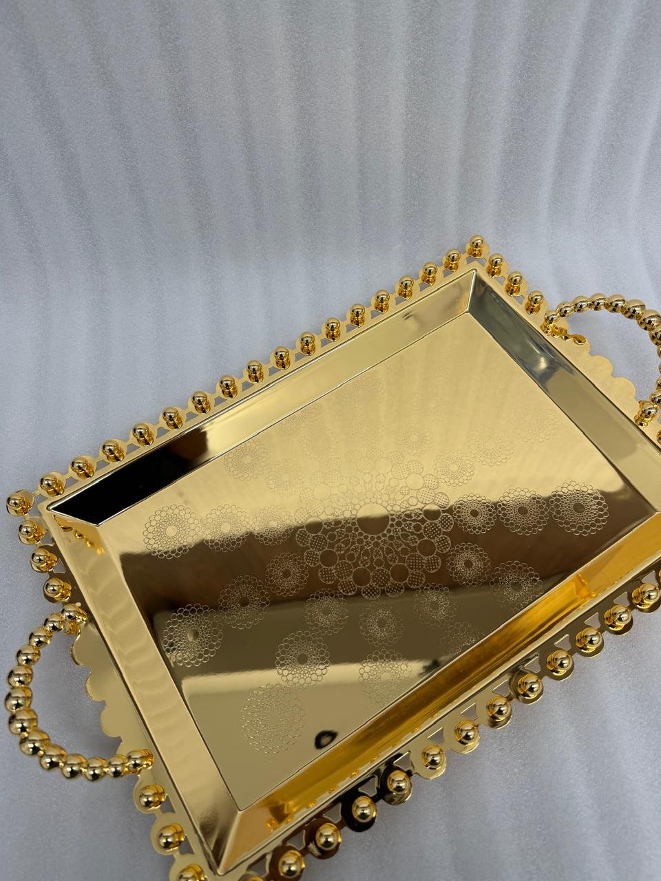 Add a touch of regal sophistication to your hosting with this exquisite 3-piece gold-plated stainless steel tray set. Featuring an intricate, laser-etched mandala design at the center and a decorative beaded “pearl” border, these trays blend traditional artistry with modern durability. The high-polish mirror finish reflects light beautifully, making them a stunning centerpiece for dining tables, coffee tables, or vanity displays. Whether you are serving refreshments to guests or organizing luxury accessories, this nesting set provides a versatile and opulent solution for any home.