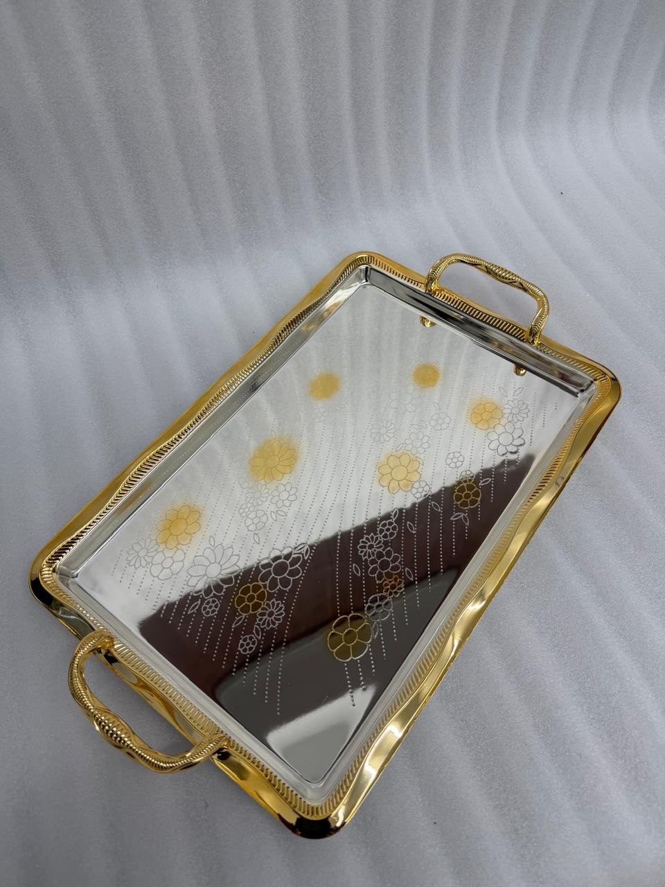 Elevate your hosting experience with this exquisite 3-piece stainless steel tray set from Onemore. Designed for those who appreciate the finer details, each tray features a high-polish mirror finish adorned with delicate, etched floral patterns in gold and silver tones. The robust gold-finished textured handles and ornate borders provide a secure grip while adding a touch of regal sophistication to your dining table or coffee station.