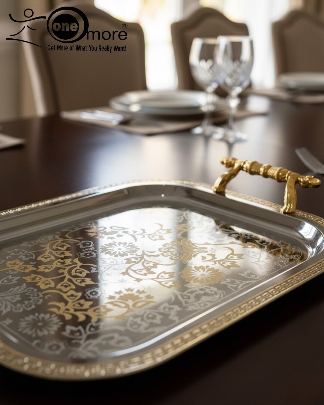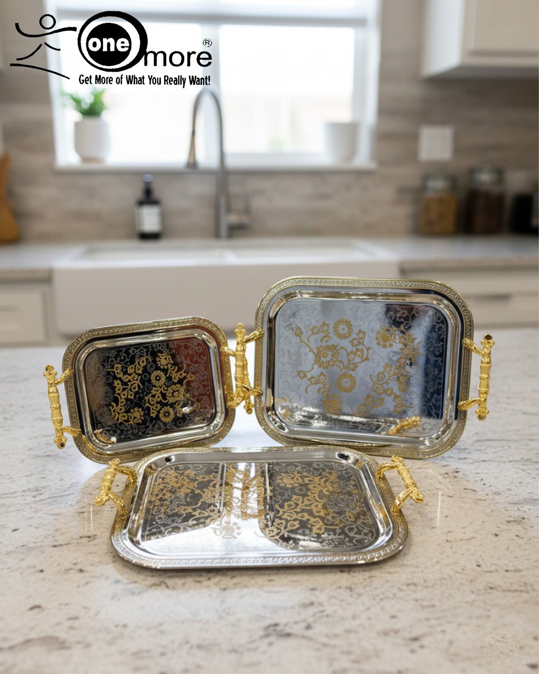 Discover the detailed craftsmanship of the “One More” Decorative Serving Tray Collection. Each tray showcases a high-shine silver base with a contrasting gold-tone filigree design embossed right into the center, offering a truly royal aesthetic. The sturdy, ergonomic gold-tone handles are beautifully textured for a secure and luxurious grip. Use them to serve wine glasses, water, coffee, or as a striking display piece for nuts, dried fruits, or decorative items. This set is the ideal blend of traditional elegance and practical function for the modern home.