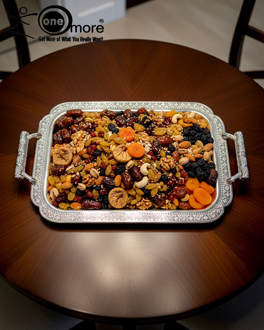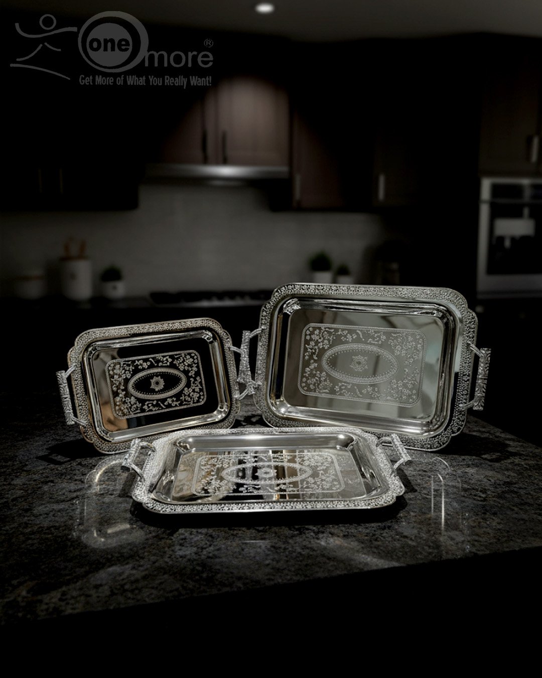Discover the detailed craftsmanship of the “One More” Decorative Serving Tray Collection. Each tray showcases a high-shine silver base with a contrasting gold-tone filigree design embossed right into the center, offering a truly royal aesthetic. The sturdy, ergonomic gold-tone handles are beautifully textured for a secure and luxurious grip. Use them to serve wine glasses, water, coffee, or as a striking display piece for nuts, dried fruits, or decorative items. This set is the ideal blend of traditional elegance and practical function for the modern home.