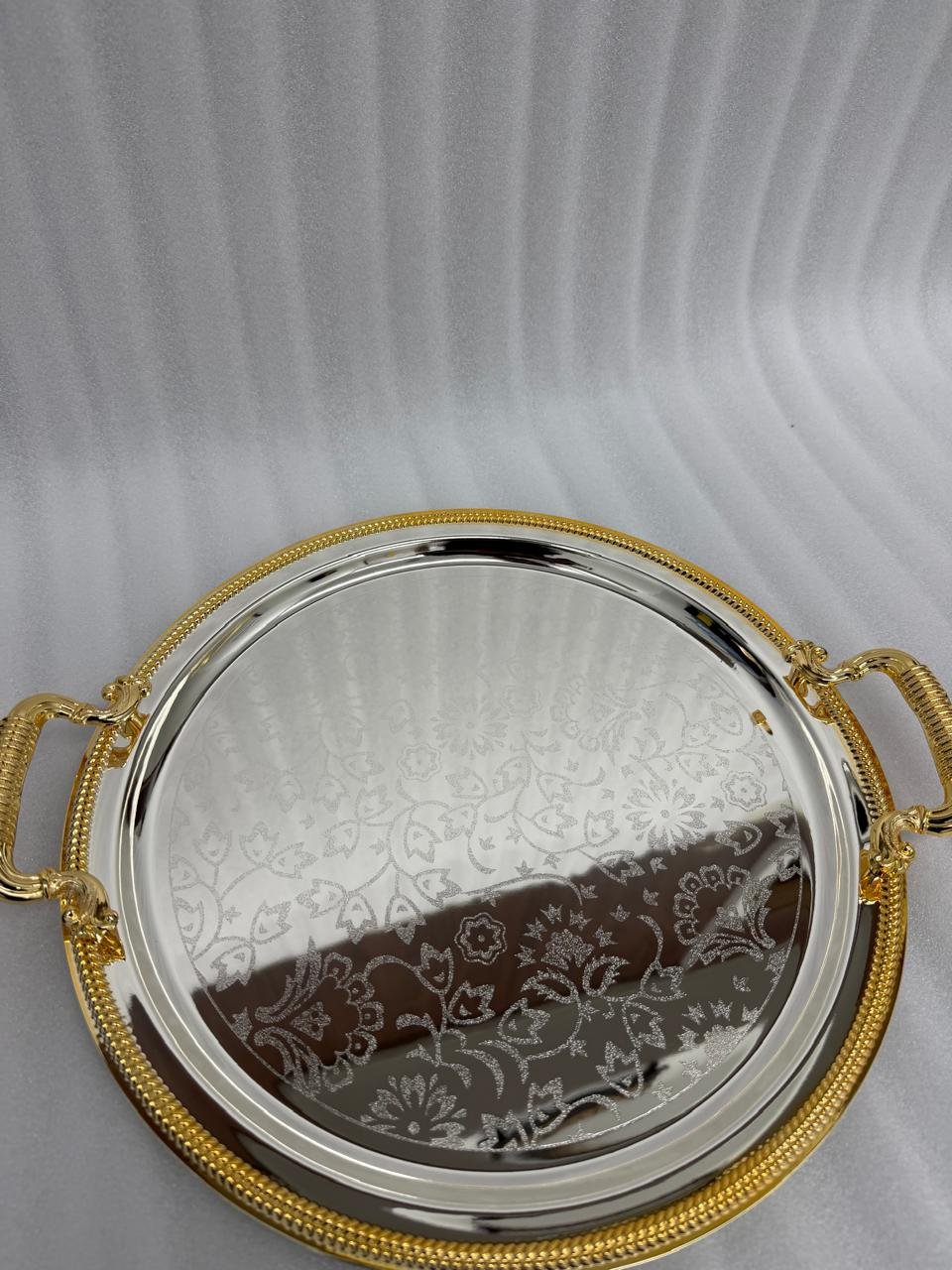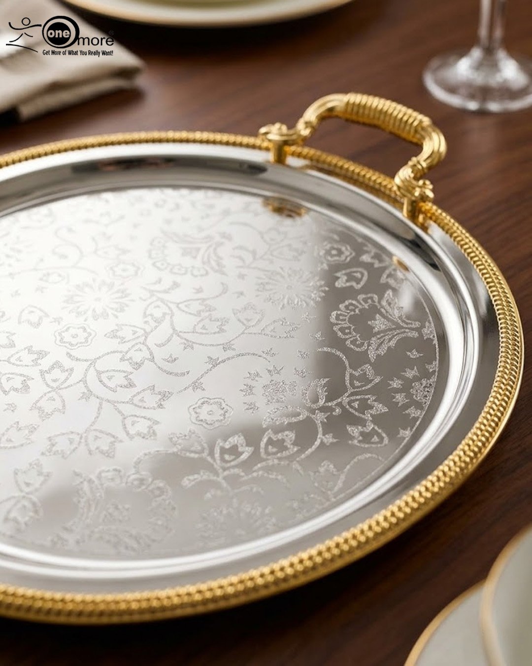 Elevate your hosting experience with this exquisite set of three round stainless steel serving trays. Each piece features a high-polish mirror finish, intricately adorned with a delicate floral etching that covers the center surface. The trays are framed by a luxurious gold-toned rope-style border and equipped with ornate, ergonomically designed handles for effortless serving. Whether you are presenting appetizers at a formal gathering or displaying decorative accents on a coffee table, this versatile set blends timeless elegance with modern durability.