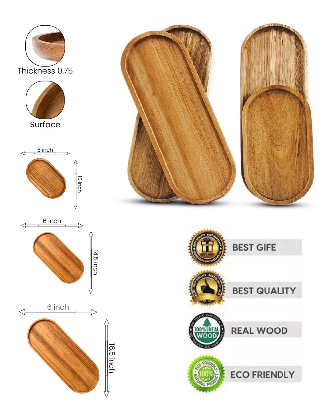Bring elegance and functionality to your table with our Oval Wooden Serving Tray, crafted from 100% real wood and designed for both everyday and special use. With a sturdy thickness of 0.75 inches and a smooth, refined surface, these trays offer a perfect blend of natural beauty and practical design. Available in 3 versatile sizes (10″, 14.5″, and 16.5″ in length), they are ideal for serving appetizers, desserts, snacks, or as decorative platters.